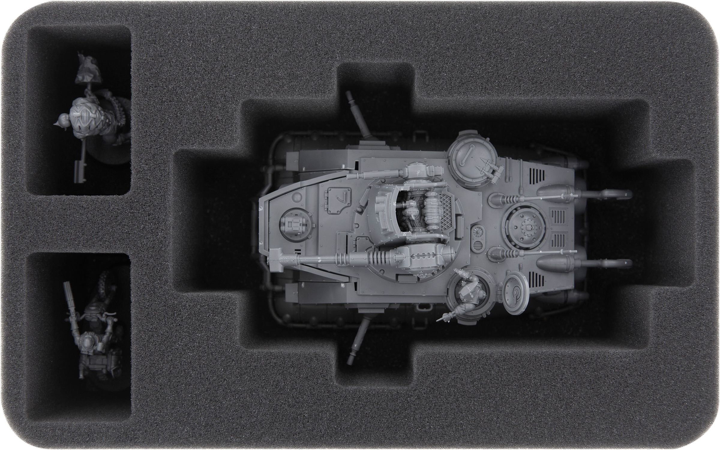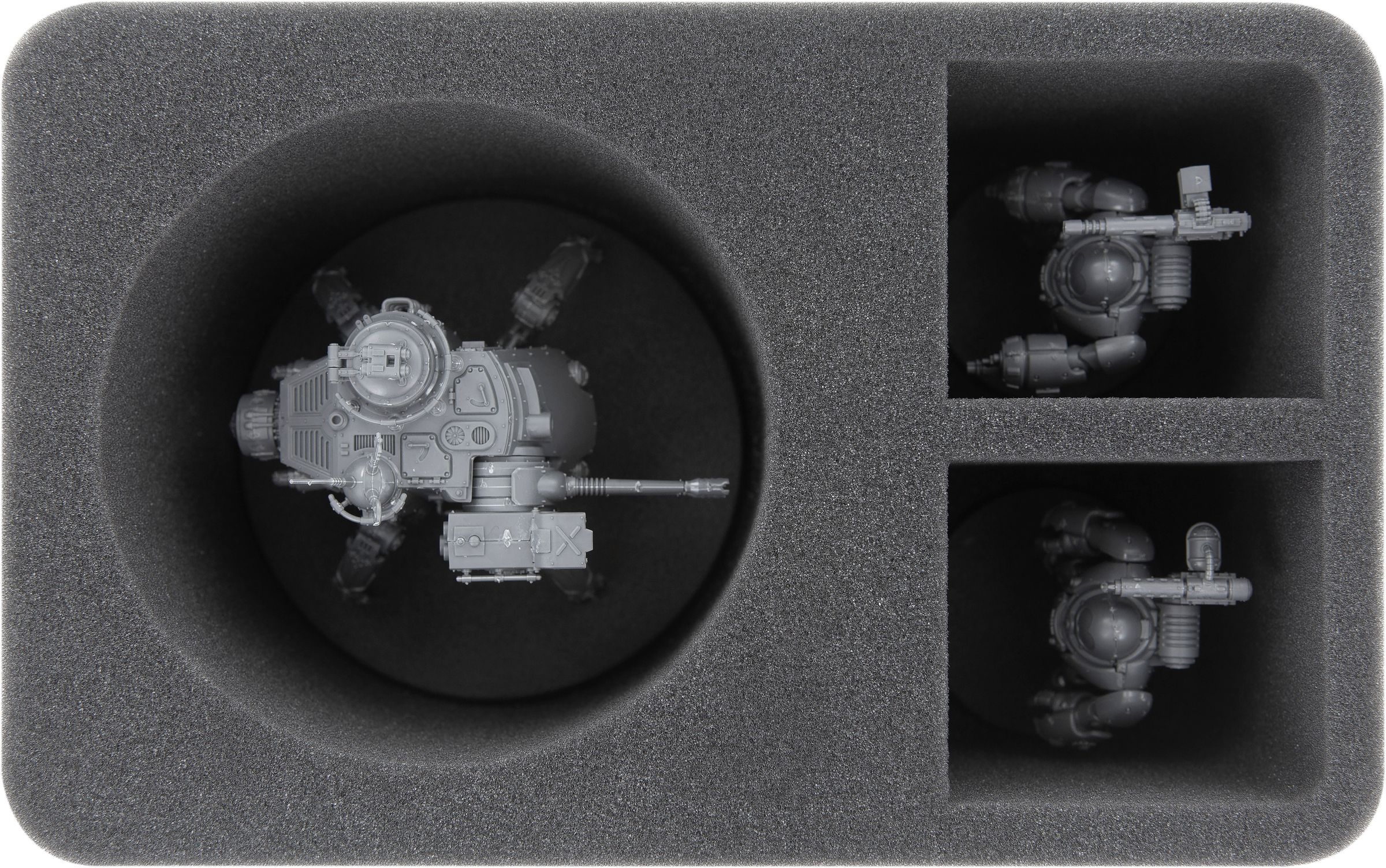 The foam tray for the Skorpius Dunerider / Skorpius Disintegrator has a large compartment which is custom cut for the Antigrav vehicle of the Adeptus Mechanicus. Whether tank or transporter, both Skorpius model variants are well protected with this insert. The two small, rectangular comparments are ideal for further miniatures of your AdMech army or for optional components.