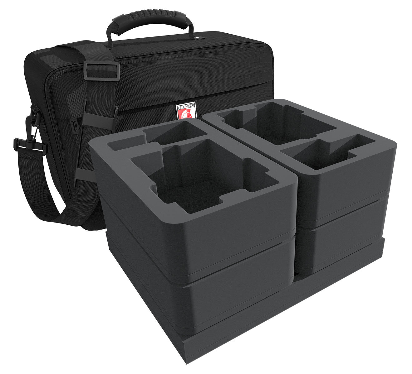 The foam inserts fit exactly into the stable MAXI bag. The bag consists of particularly hard-wearing material. Padded side panels and a reinforced base also ensure that your models are well-protected from external influences when transported by car or train. In addition to the large main compartment, the bag has a small zippered compartment on the front. There is a rubberized, handy carrying handle on the top. Suppose you prefer to have your hands free. In that case, the bag can also be used comfortably as a shoulder bag thanks to the wear-resistant, detachable shoulder strap.
