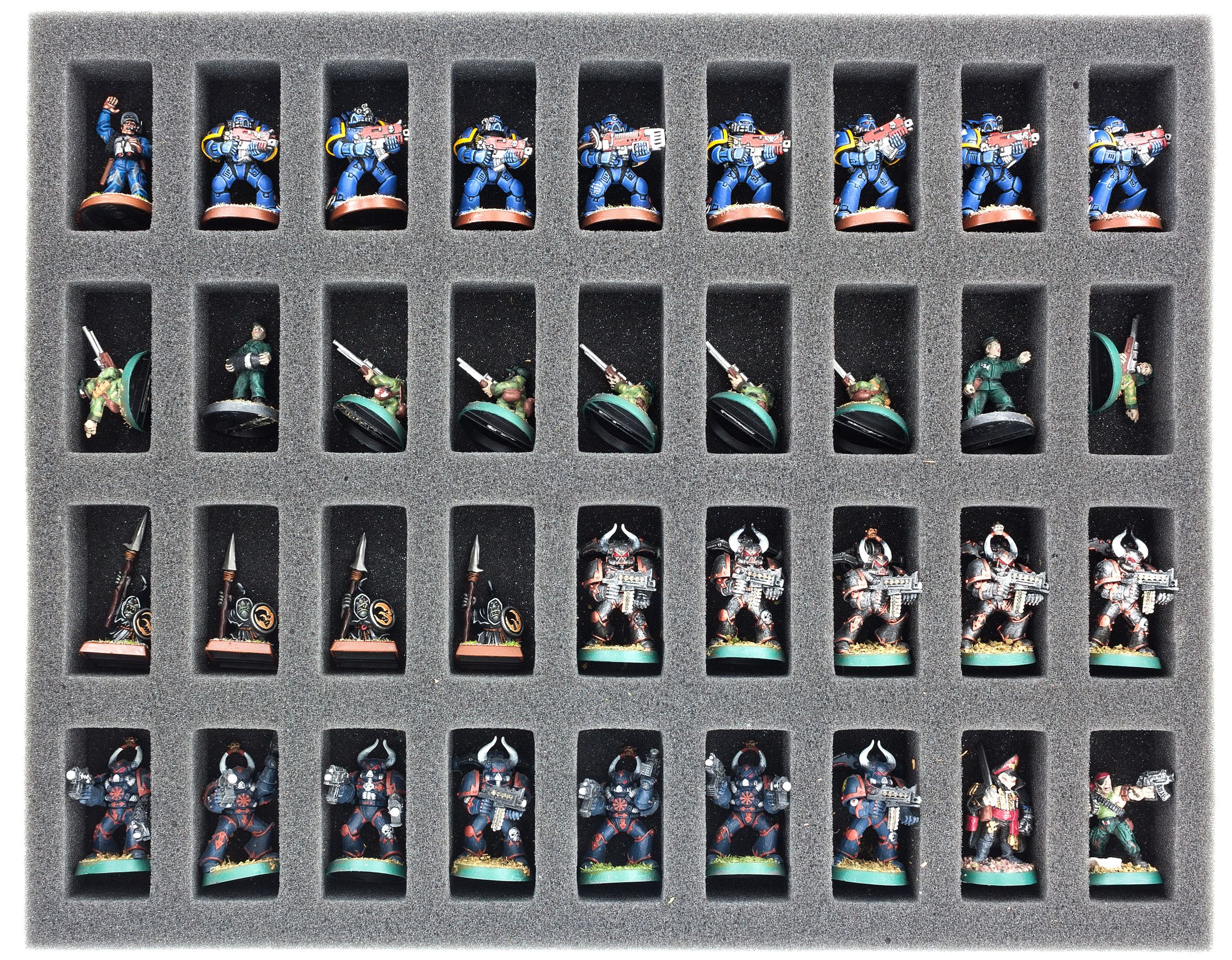 - 1 Full-Size foam tray with 36 compartments for standard infantry units like Cadians, Catachan Jungle Fighters and miniatures with similar dimensions (FS035A014)