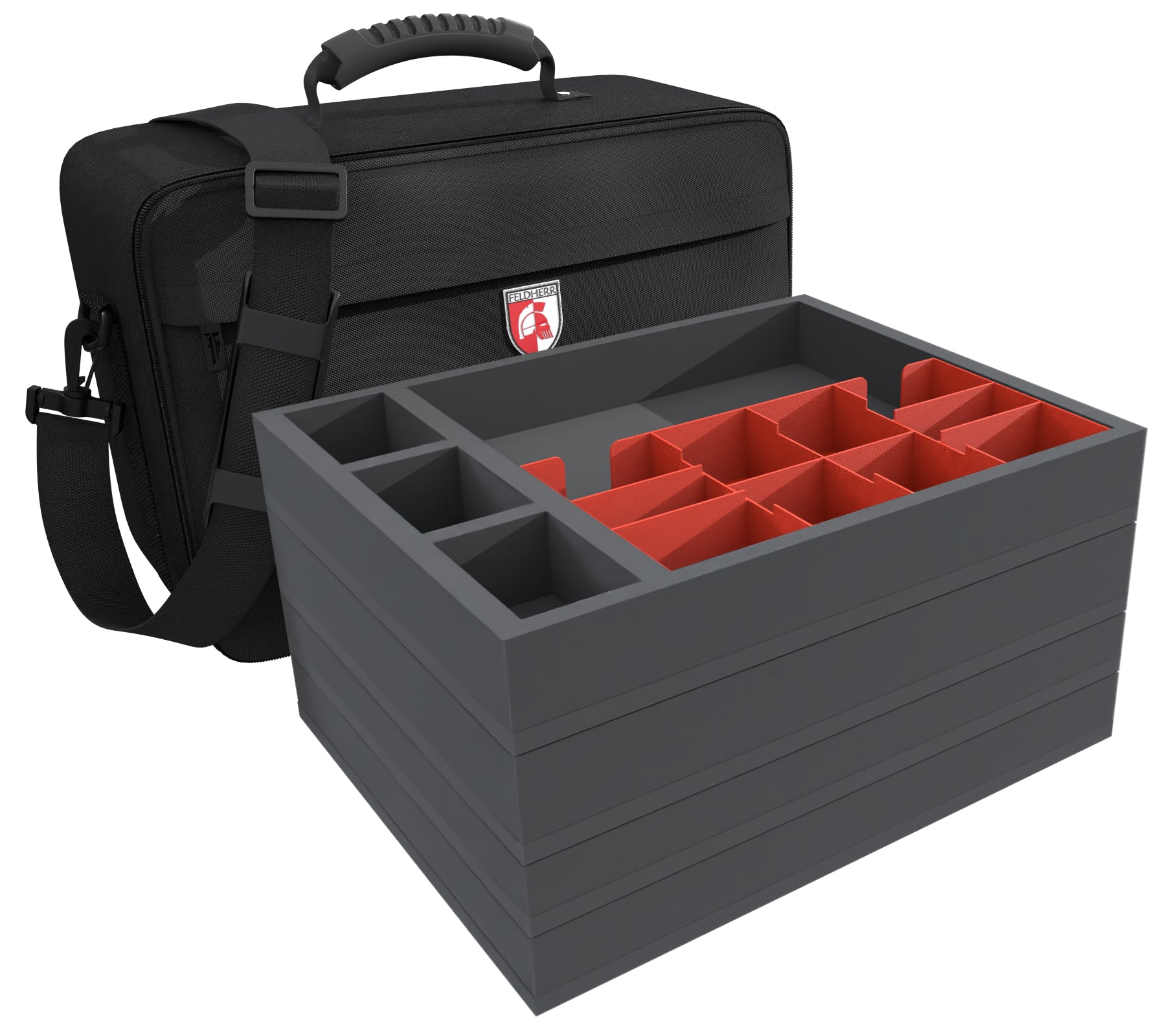 Instead of lugging around miniatures and game materials in the bulky game box, you can conveniently and securely transport them in this MAXI bag, complete with Feldherr foam tray and Organizer Insert.