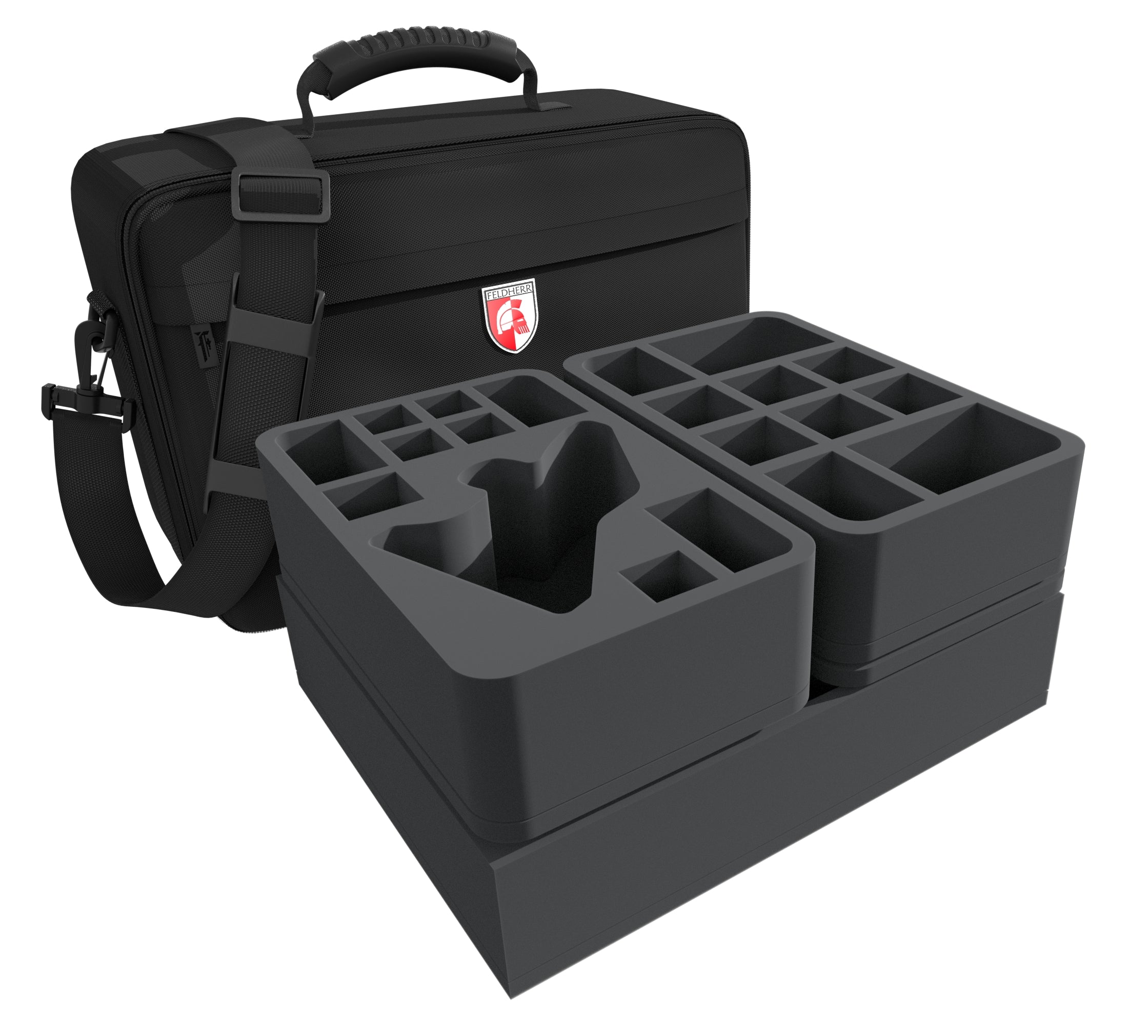 This MEDIUM PLUS bag, filled with matching Feldherr foam trays, provides space for all 25 miniatures from the Adeptus Mechanicus: Battleforce – Omnissiah's Talon Set by GamesWorkshop.