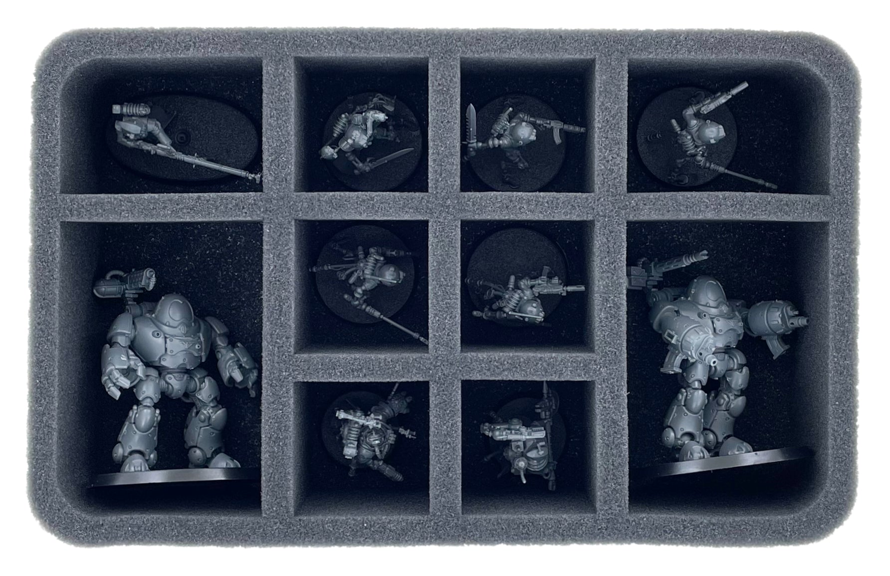 • 1 Half-Size foam tray with 9 compartments for Ironstrider Ballistarius, Sydonian Dragoon, standard infantry such as Skitarii Rangers or Electro Priests (HSMETV080BO)
