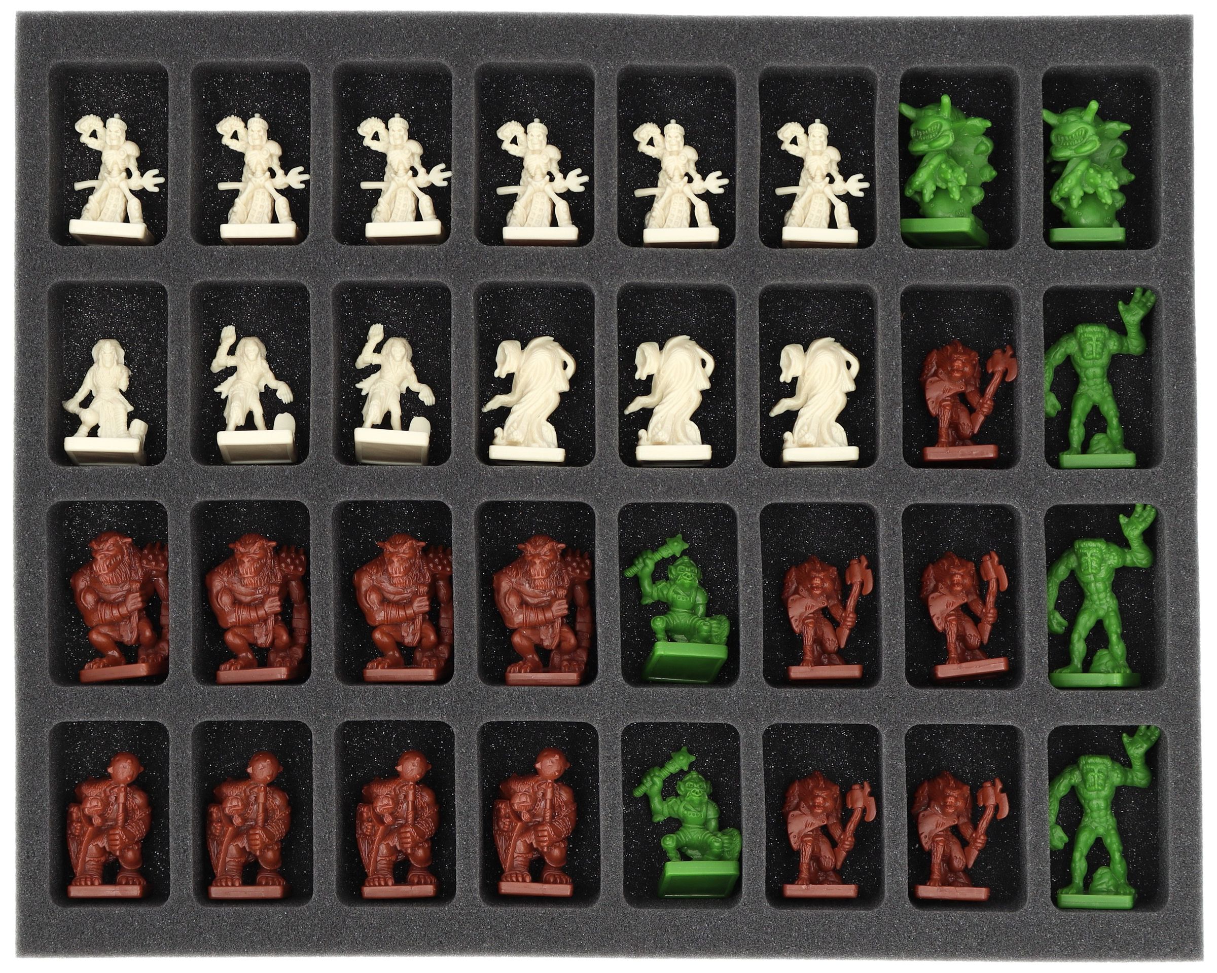 - 1 Full-Size foam tray with 32 compartments for miniatures like monsters, heroes and miniatures with similar dimensions (FSMEDS040BO)