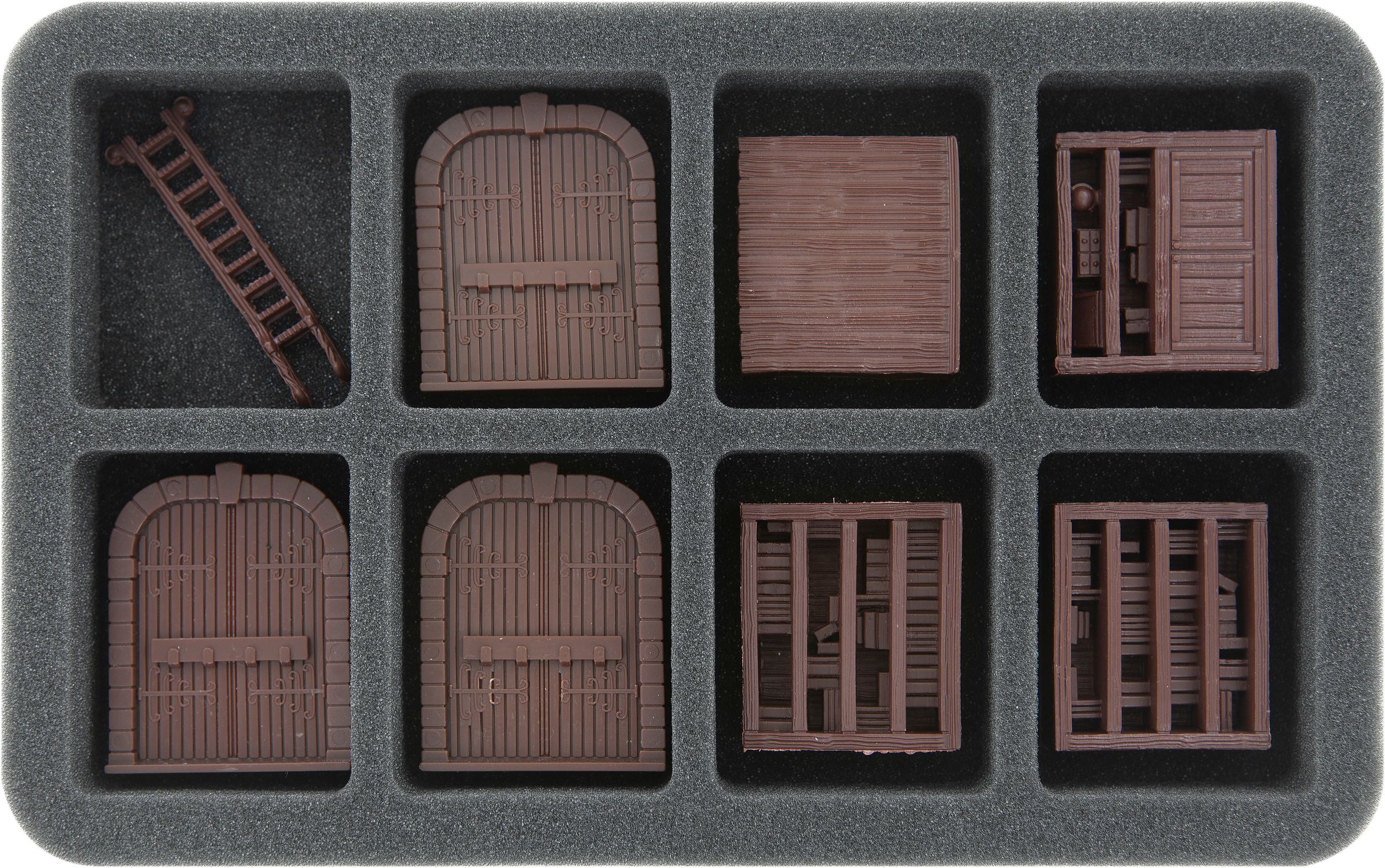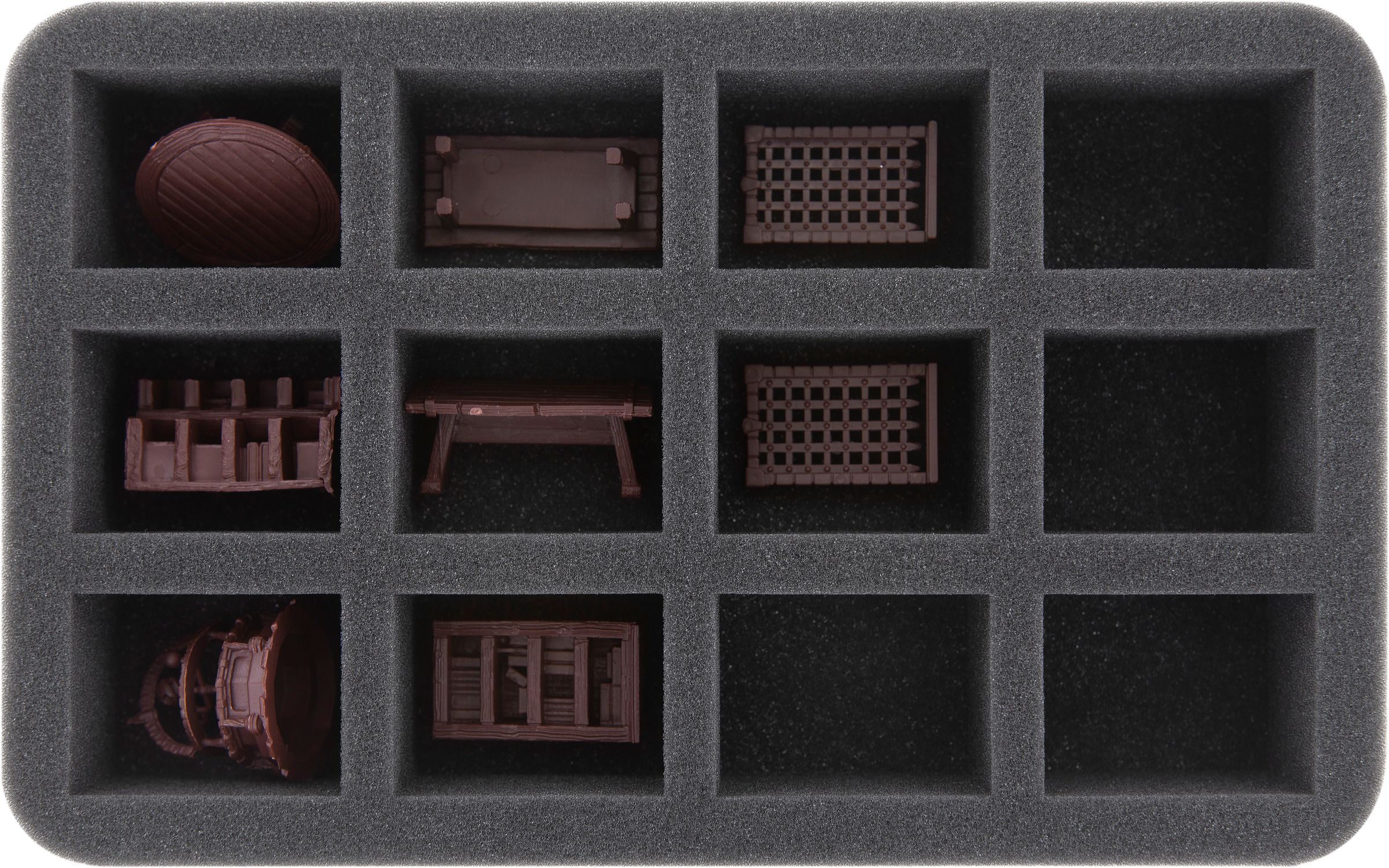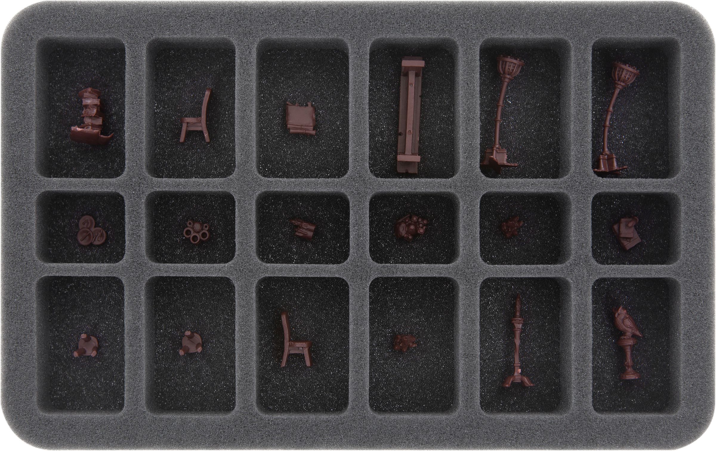 Your 3D scenery miniatures enjoy the best possible protection in our fine-pored foam trays. Delicate miniatures like mirror and armchair stay intact, the color of painted models does not get scratched because each miniature gets its own compartment.