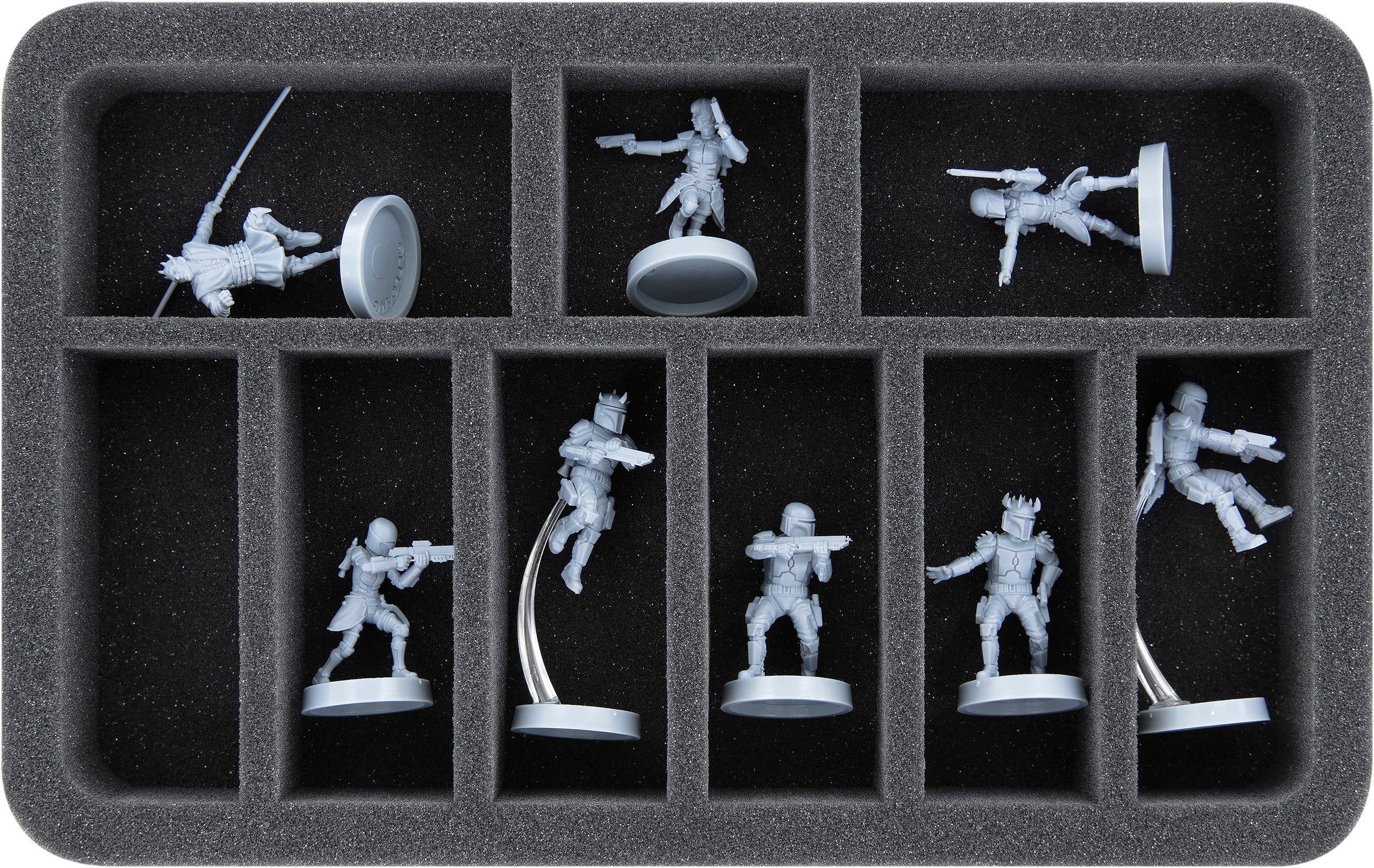 • 1 Half-Size foam tray with 10 compartments for Mandalorian Super Commandos and Maul (HSFW045BO)
