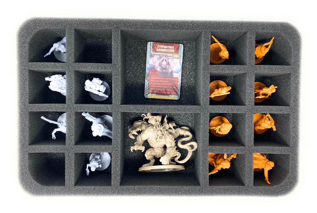 The Half-Size insert offers a cozy home for all figures with its 18 compartments. The Stepmother Abomination finds some nice space in one of the two large ones, while the rest of the Survivor models are on standby in the small compartments next door.