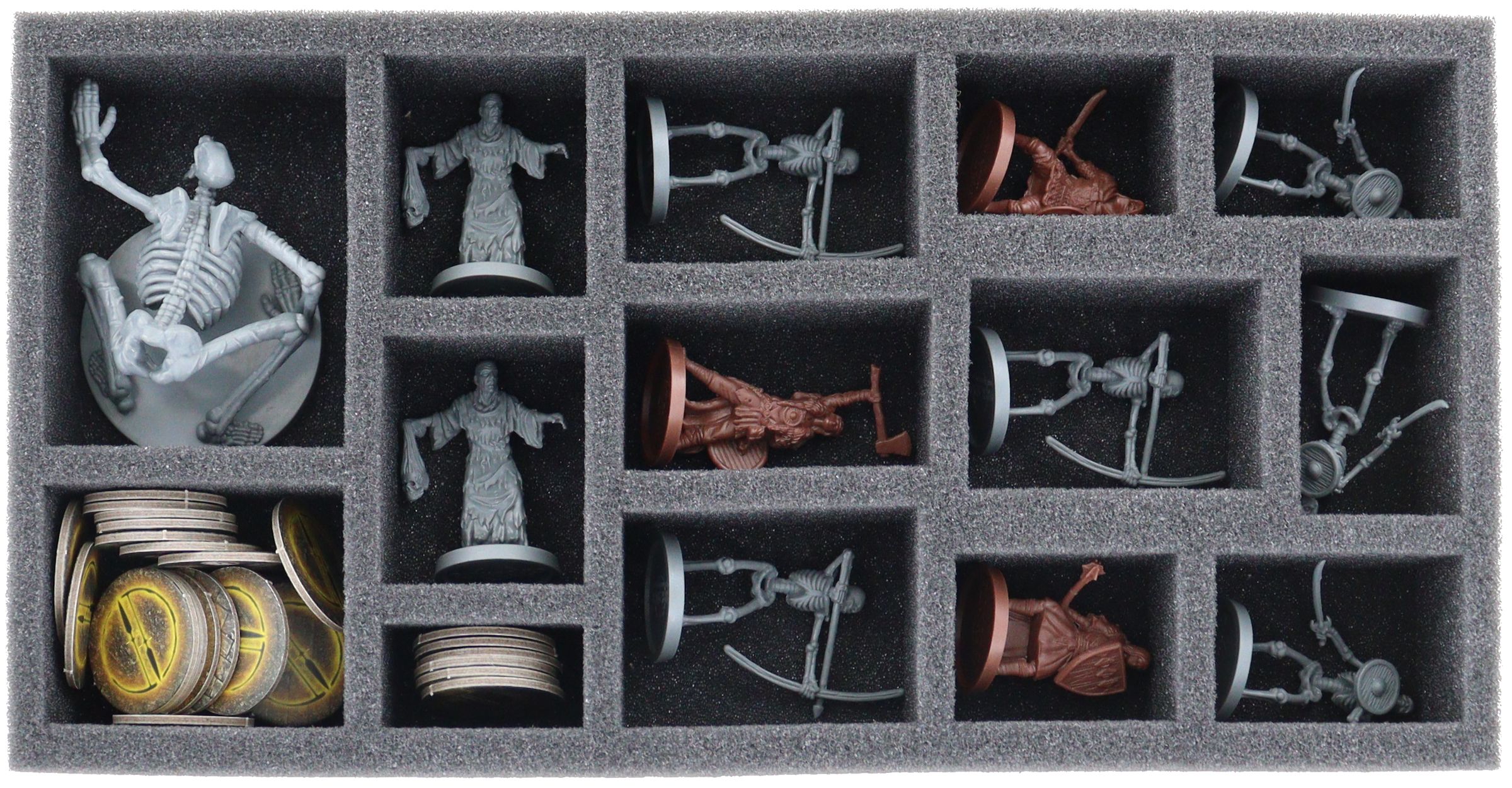• 1 foam tray with thirteen compartments for Necromancer, Skeleton Archer, Skeleton Beast, and Skeleton Soldier. Cleric, Pyromancer, Thief + Trap Token, Barrel Token