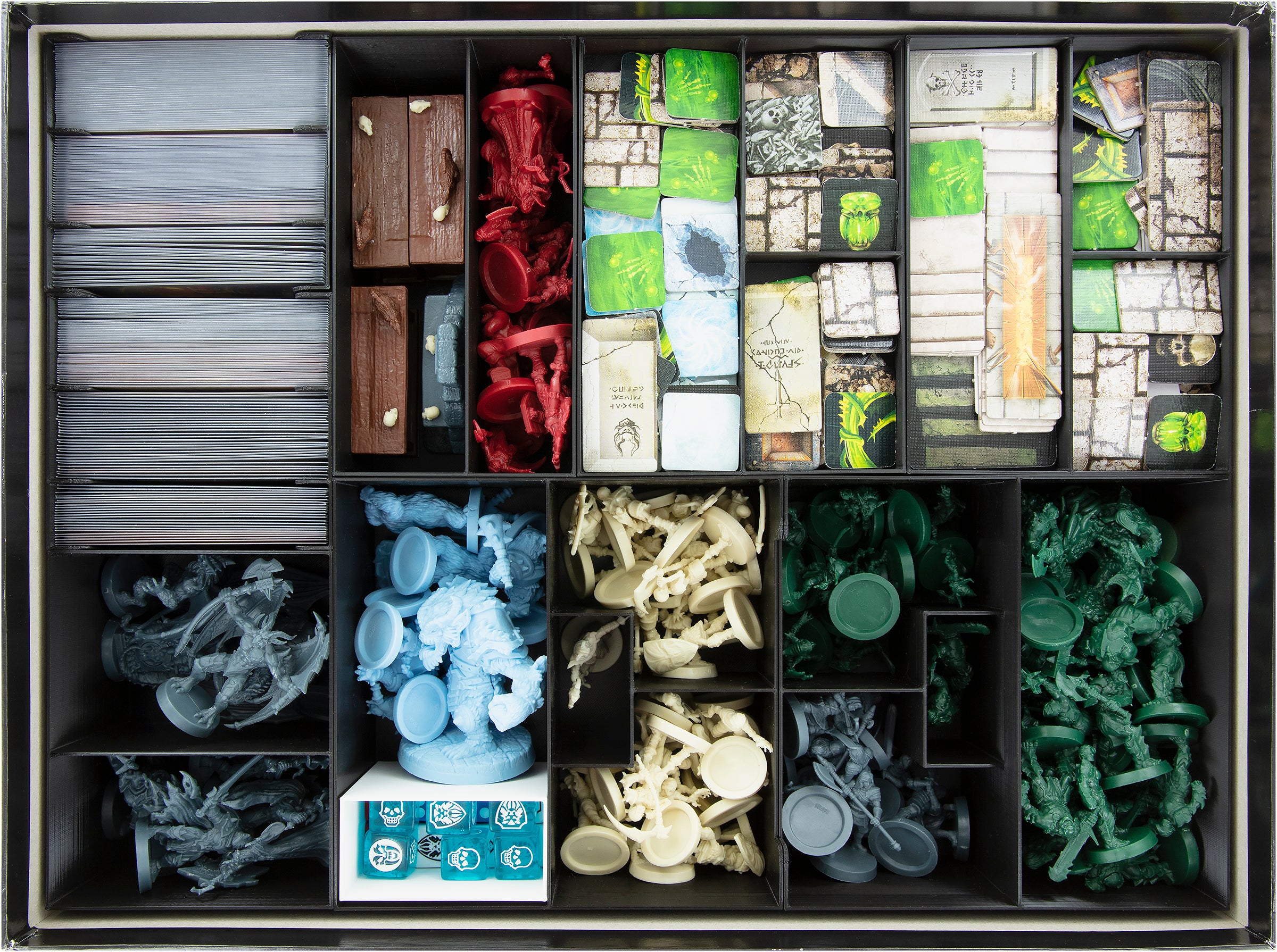Thanks to this Organizer, the bad guys have nothing to laugh about. While you take responsibility for the board and lead the warriors through sinister dungeons, we take care of the contents in the board game box. Six figure holders ensure that all miniatures and pieces of furniture are compactly stowed in the box. The small game material finds room in the two token holders while you sort the game cards into the two card holders. Place the dice in the dice cup and store them in one of the large compartments of the minion trays.