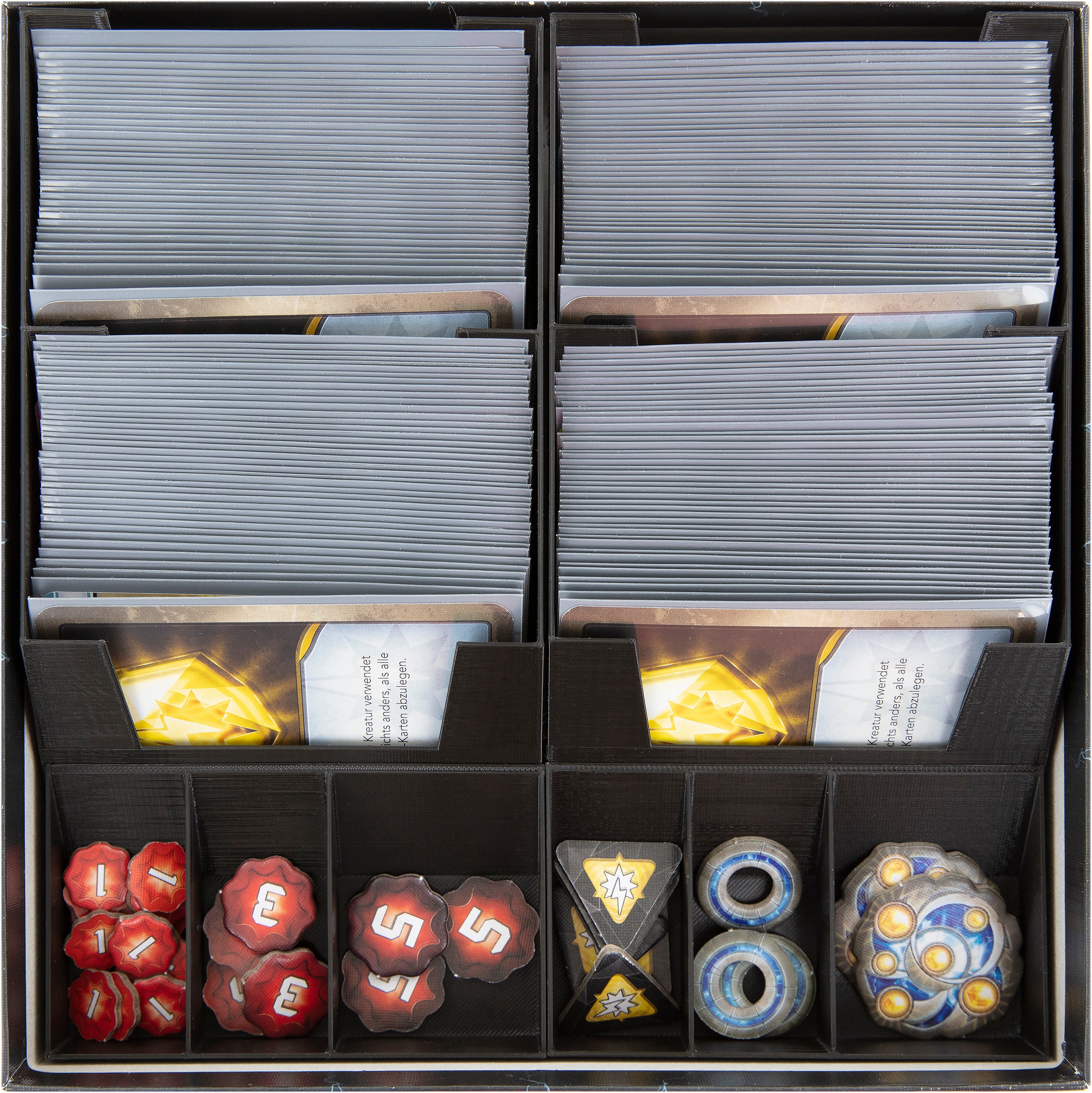 • The Organizer fits neatly into the original board game box of the "Keyforge: Mass Mutation" Starter Set.