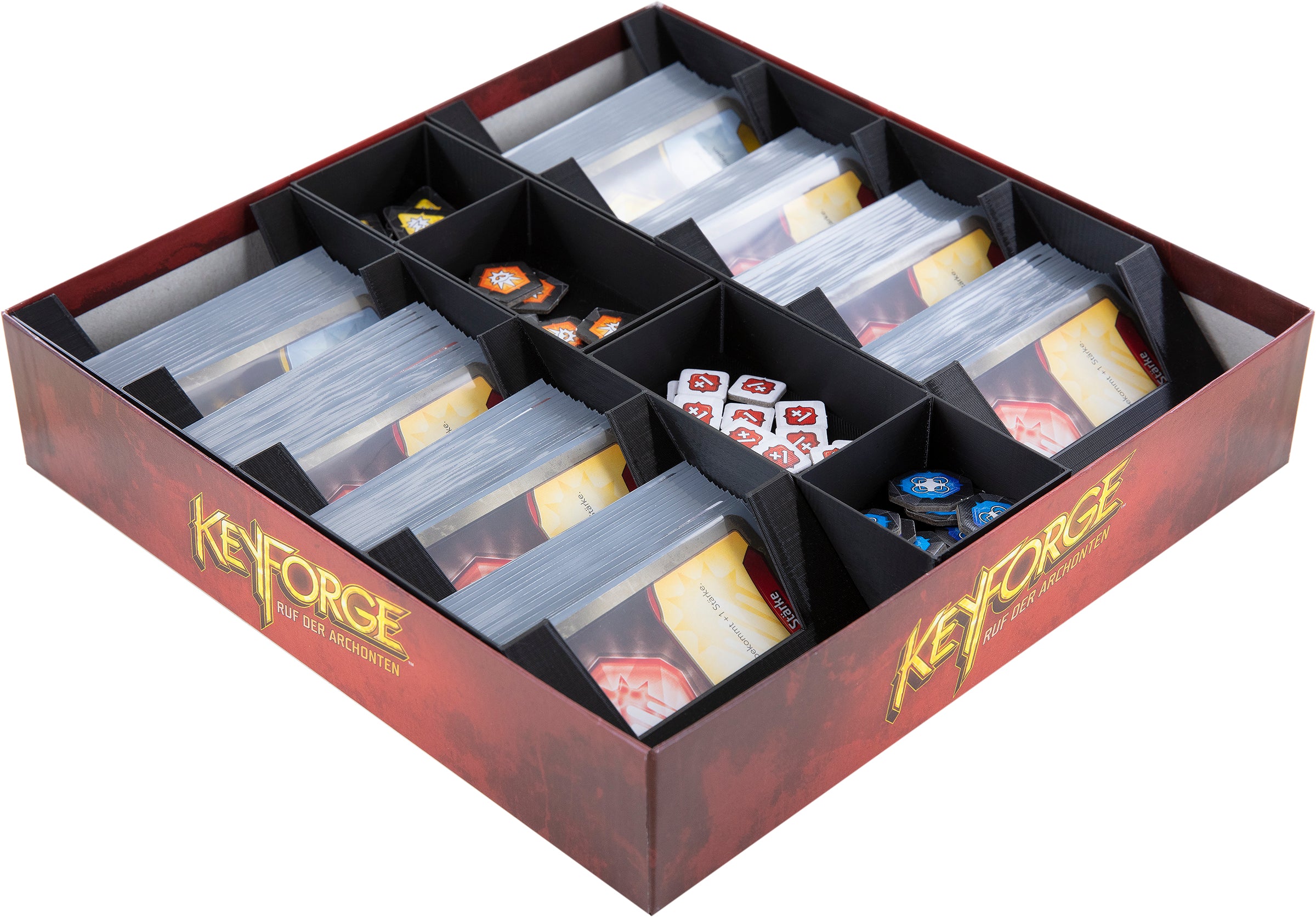 Of course, you can simply stuff your decks into your backpack and hope that they survive the transport unscathed. Or you can use the Feldherr Organizer suitable for the board game box of the “Keyforge: Call of the Archons” Starter Set to store your cards. This keeps your box organized, your cards protected from bends and scratches, and also gives you room to expand your collection.