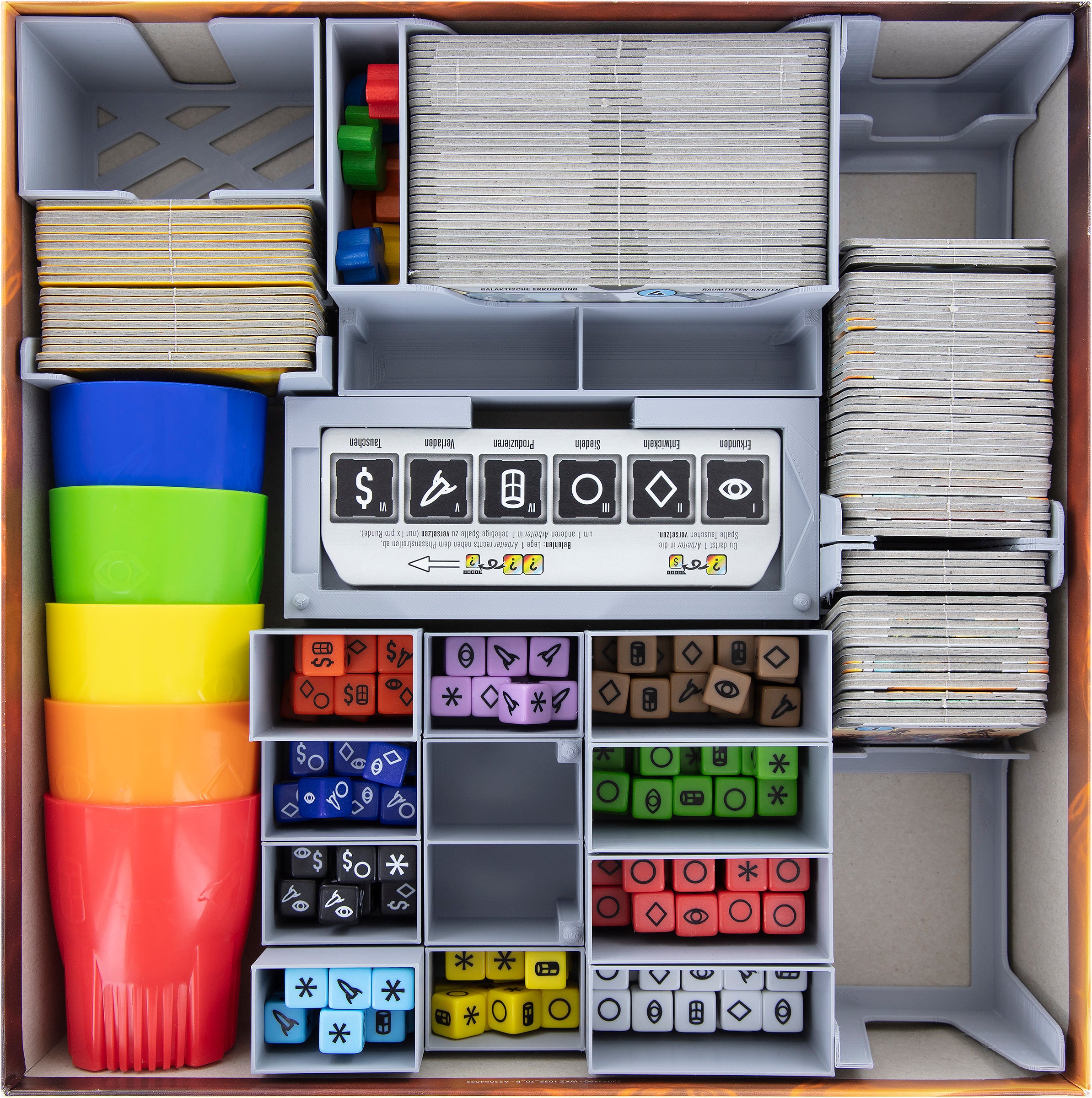 While you roll out the fate of the galaxy, we take care of the organization in your box and on the game table. For a quick start to the game, you take the 18 individually removable token holders from the box and distribute them on the game table. This helps to keep track of your token and speeds up the game setup.