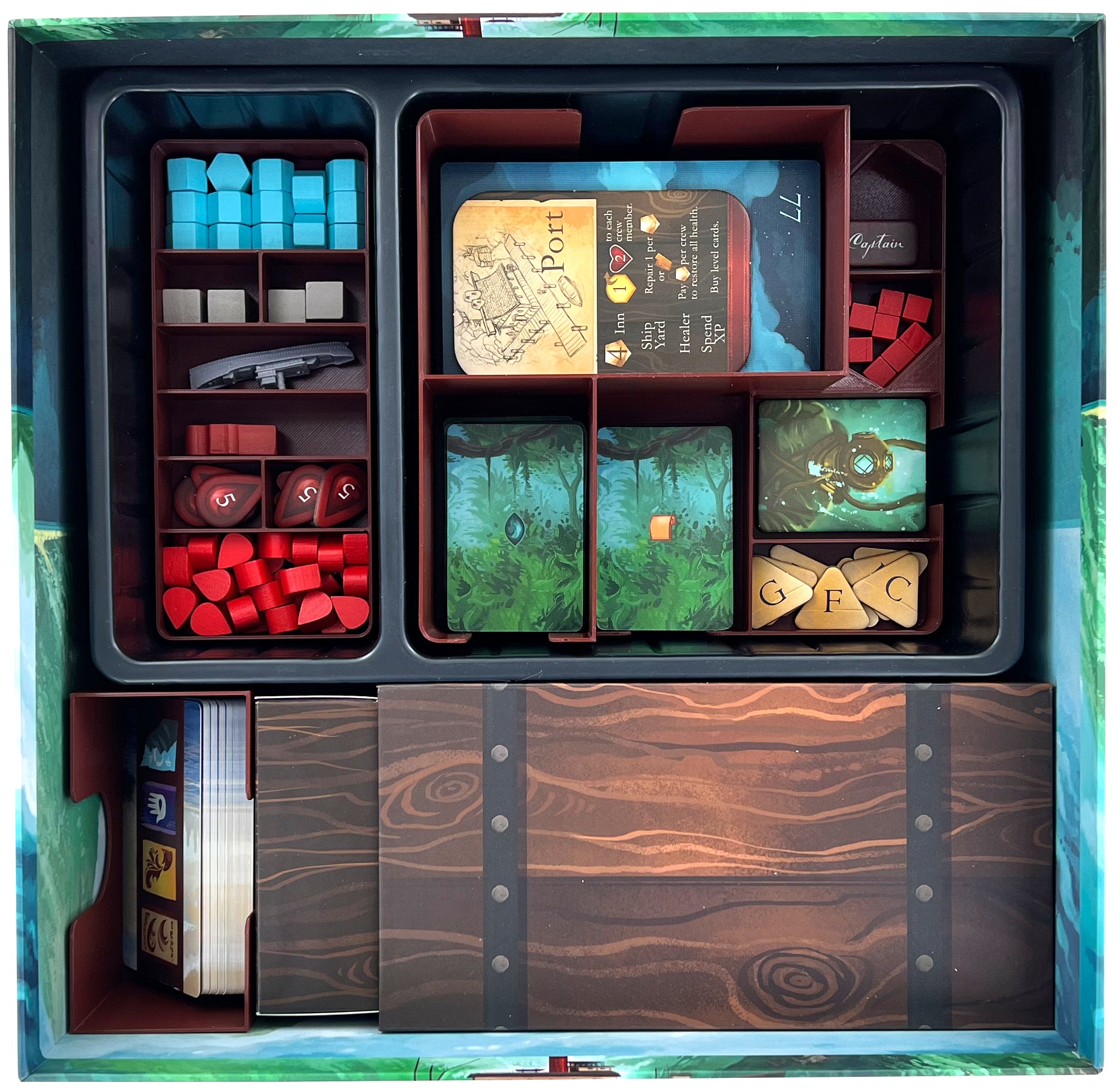 • 1 plastic card holder with seven compartments for large-format cards like Enemy Cards + small-format cards like Ability Cards + small-scale game material like Ship Damage Cubes, Explore Tokens, Captain Token + tokens like Port Board tokens, Diving Suit Tokens, Pollen Potion Tokens< /li>