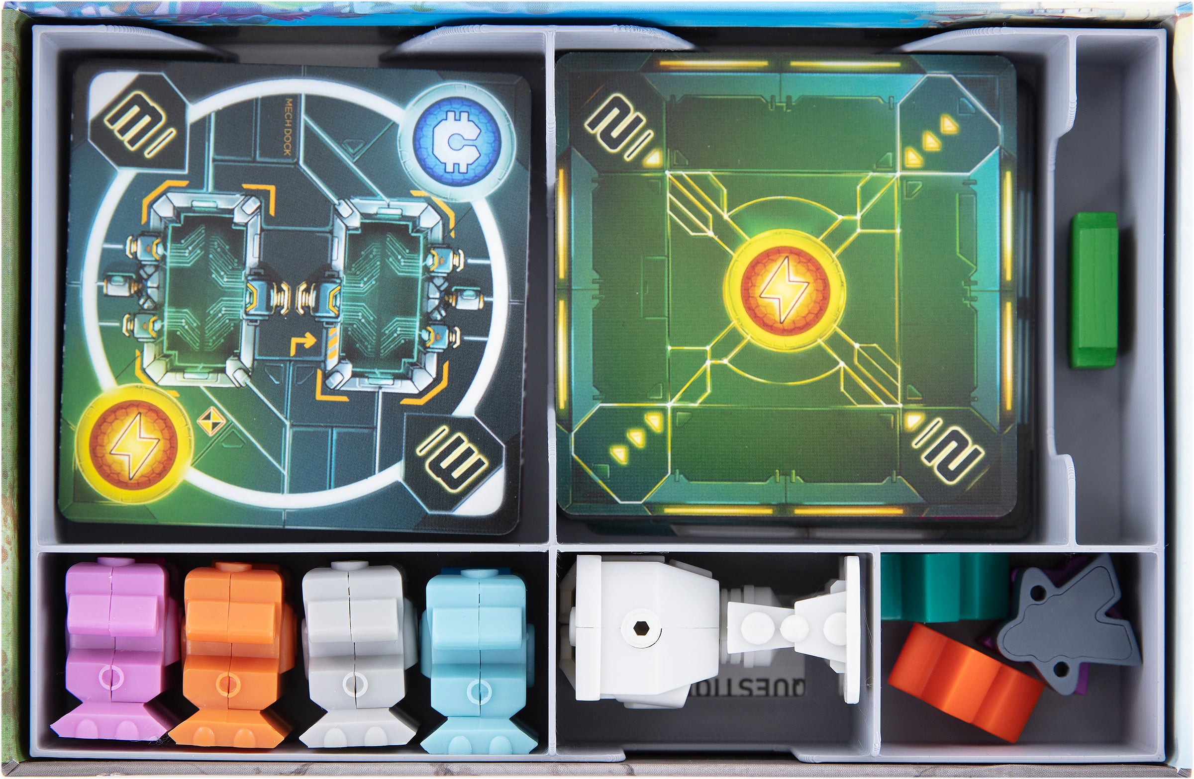 • 1 token holder with six compartments for Power Armors, ITEMeeple, Kickstarter exclusive Pilot ITEMeeples, First Player Token, Round Token, and square-format game cards (Zone, Weapon, Program, and Ad hoc Mode Cards). Of course, the game cards also fit with protective sleeves.