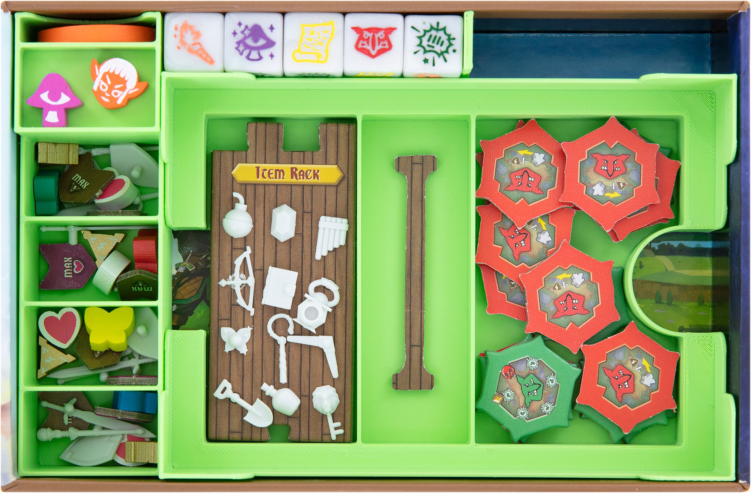 • The Organizer provides room for all the Meeples, items, cards, and game materials from Tiny Epic Quest.