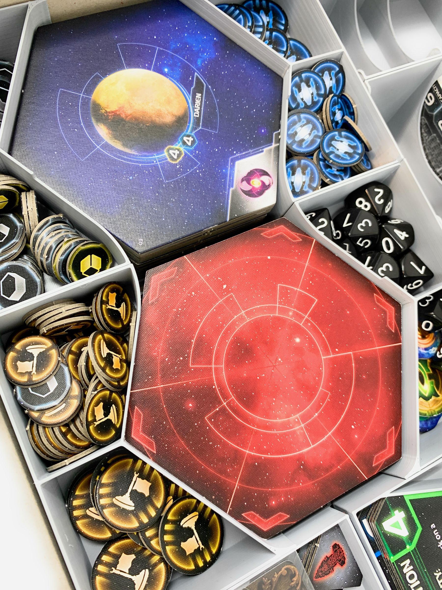 • 2 large plastic card holders with 3 compartments each for game cards like Planet cards, Objective Cards, Unit Upgrade Technology Cards.