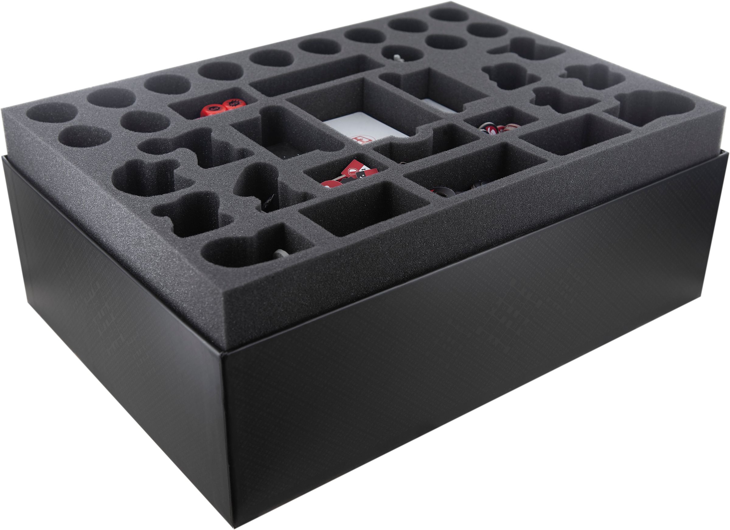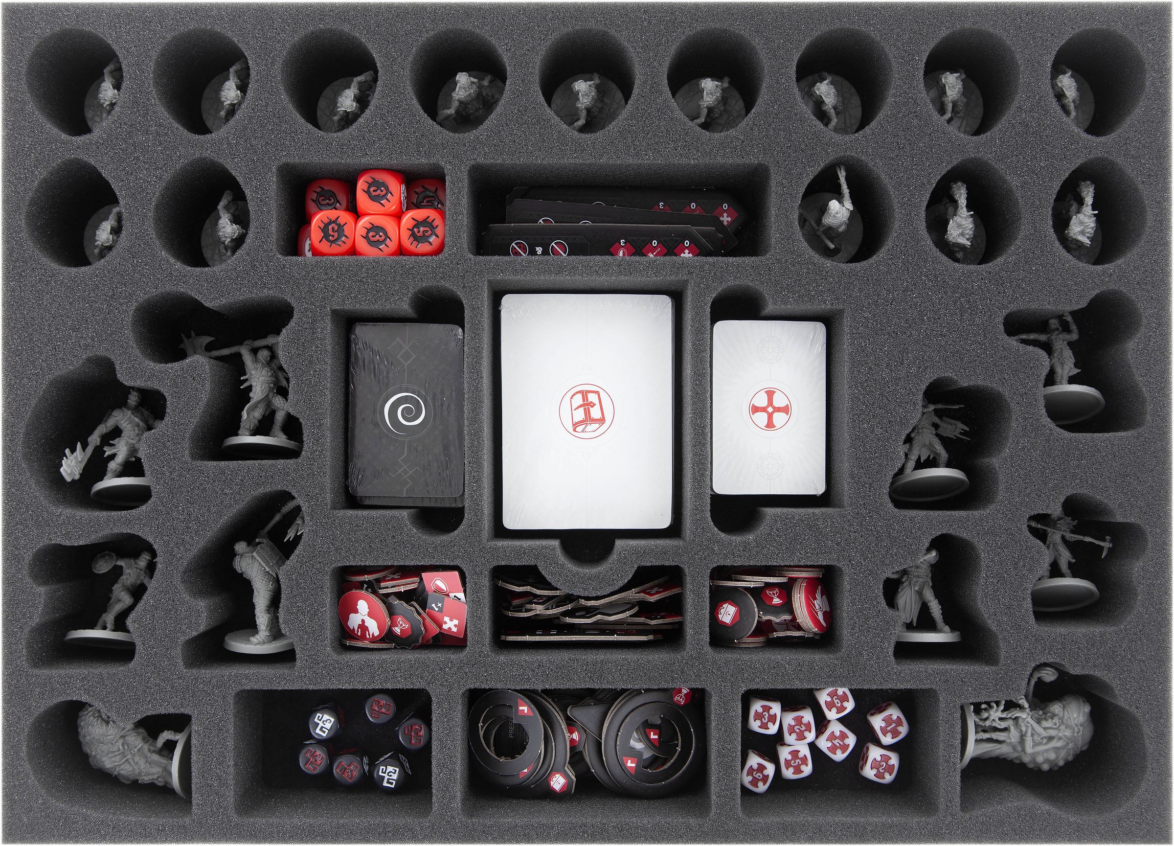 • 1 foam tray with 34 compartments for miniatures, (sleeved) cards, token and dice (DOMEQK050BO)
