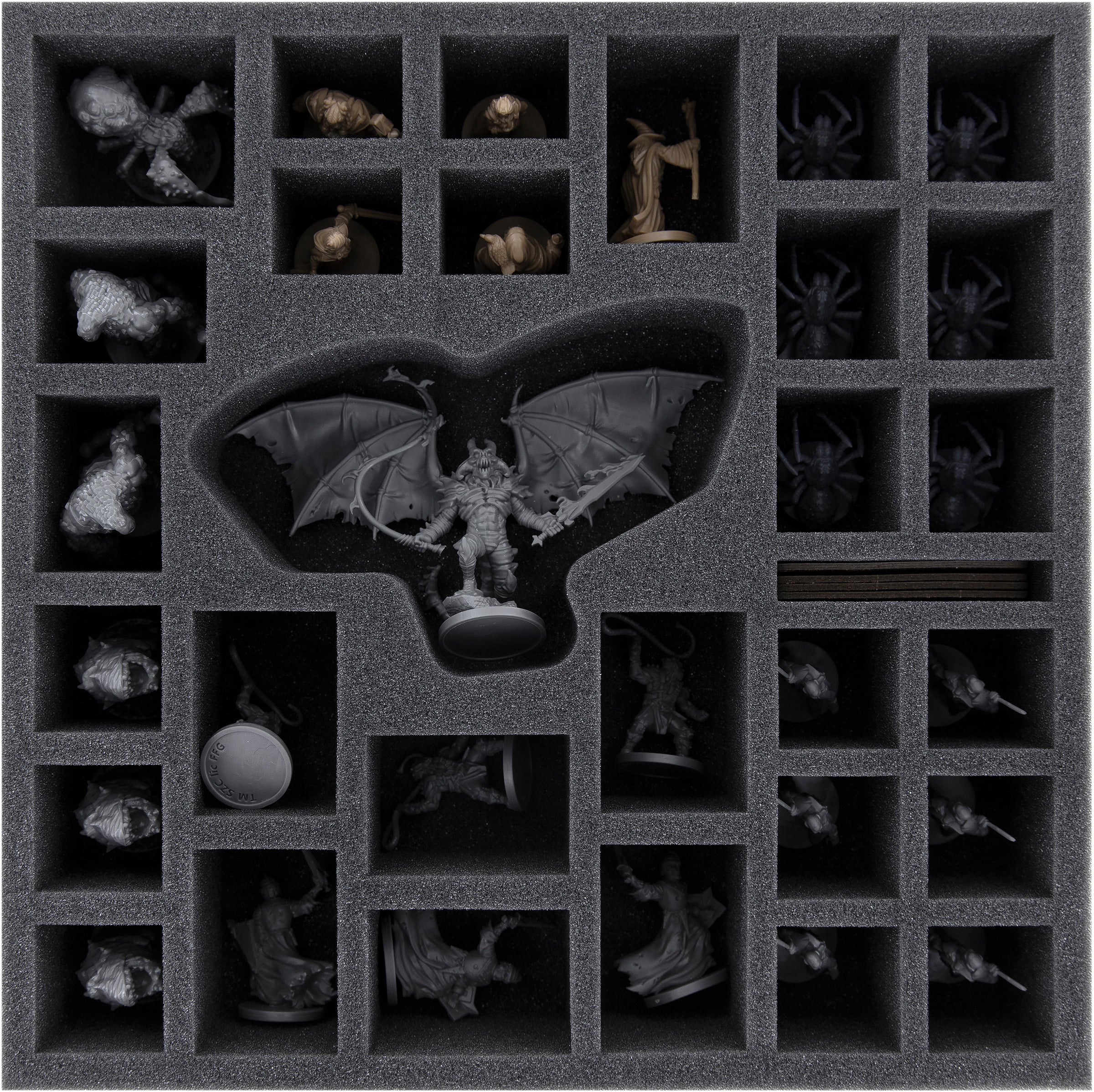 In the upper foam tray you can place the miniatures. Arwen, Balin, Dis, Eleanor and Gandalf, as well as the Balrog and the other 24 figures of your enemies, will be assigned their own miniature-precisely cut compartments. Thanks to the precise fit the detailed miniatures stay safely in place even when the box is transported.