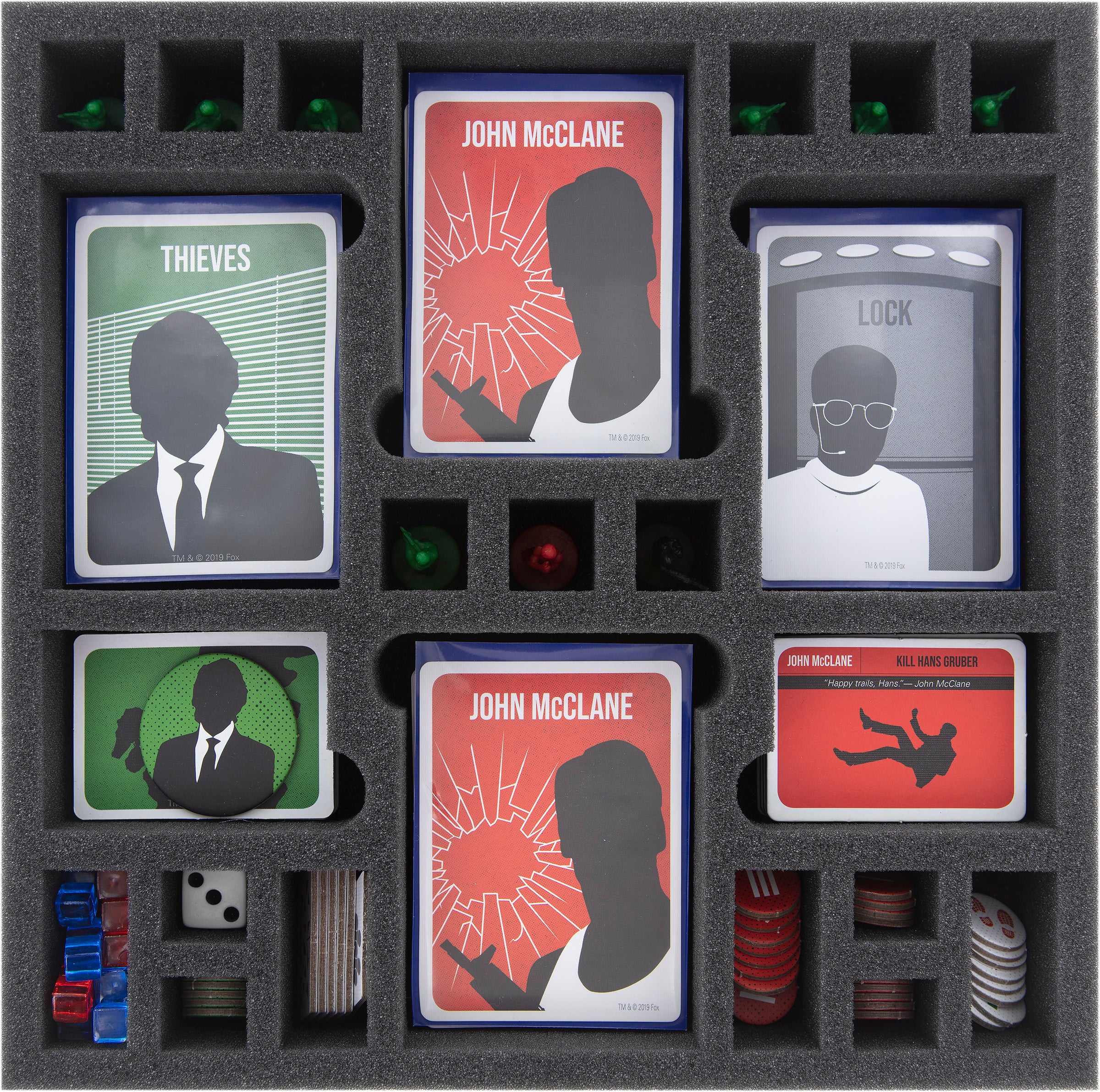 • The set fits exactly into the original board game box for "Die Hard: The Nakatomi Heist" by USAopoly (The OP).
