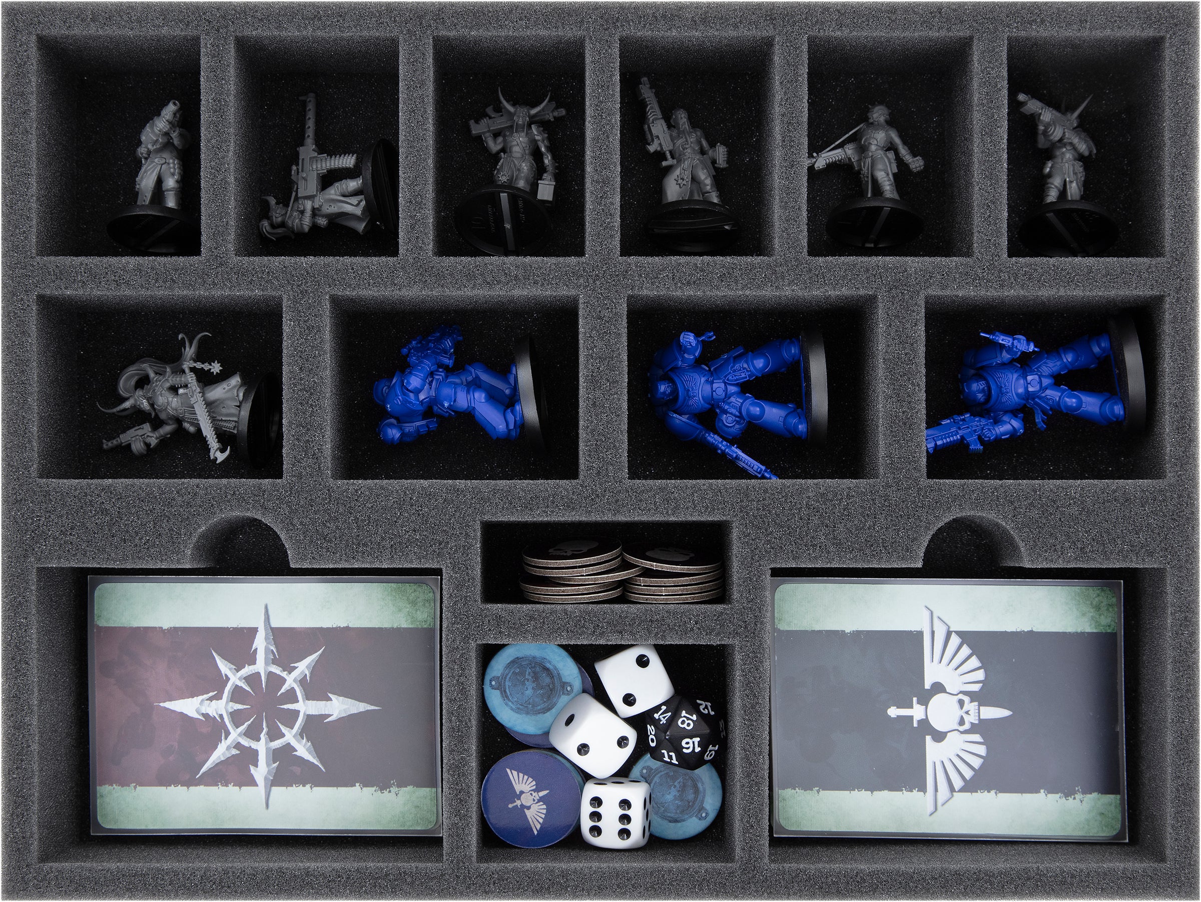 • The foam set offers space for all miniatures, cards and the entire game material of the stand-alone game "Space Marine Adventures: Doomsday Countdown".