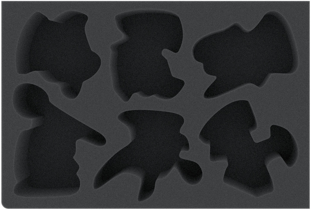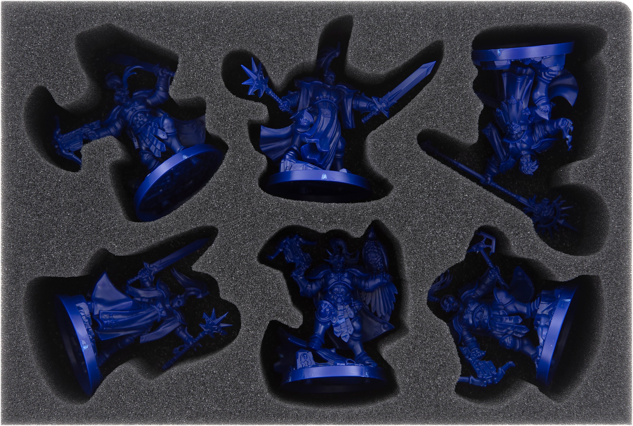 The inlay is divided into 6 miniature-precise cut compartments for Alya the Stalwart, Uran Trueblade, Thurnos Brightsoul, Oswin the Swift, Quain Hawksight, and Bran Surebolt.