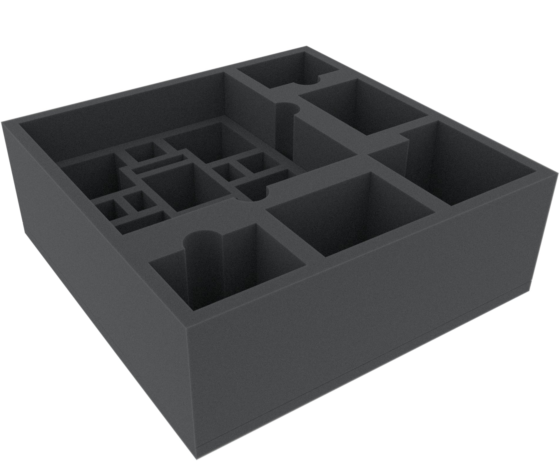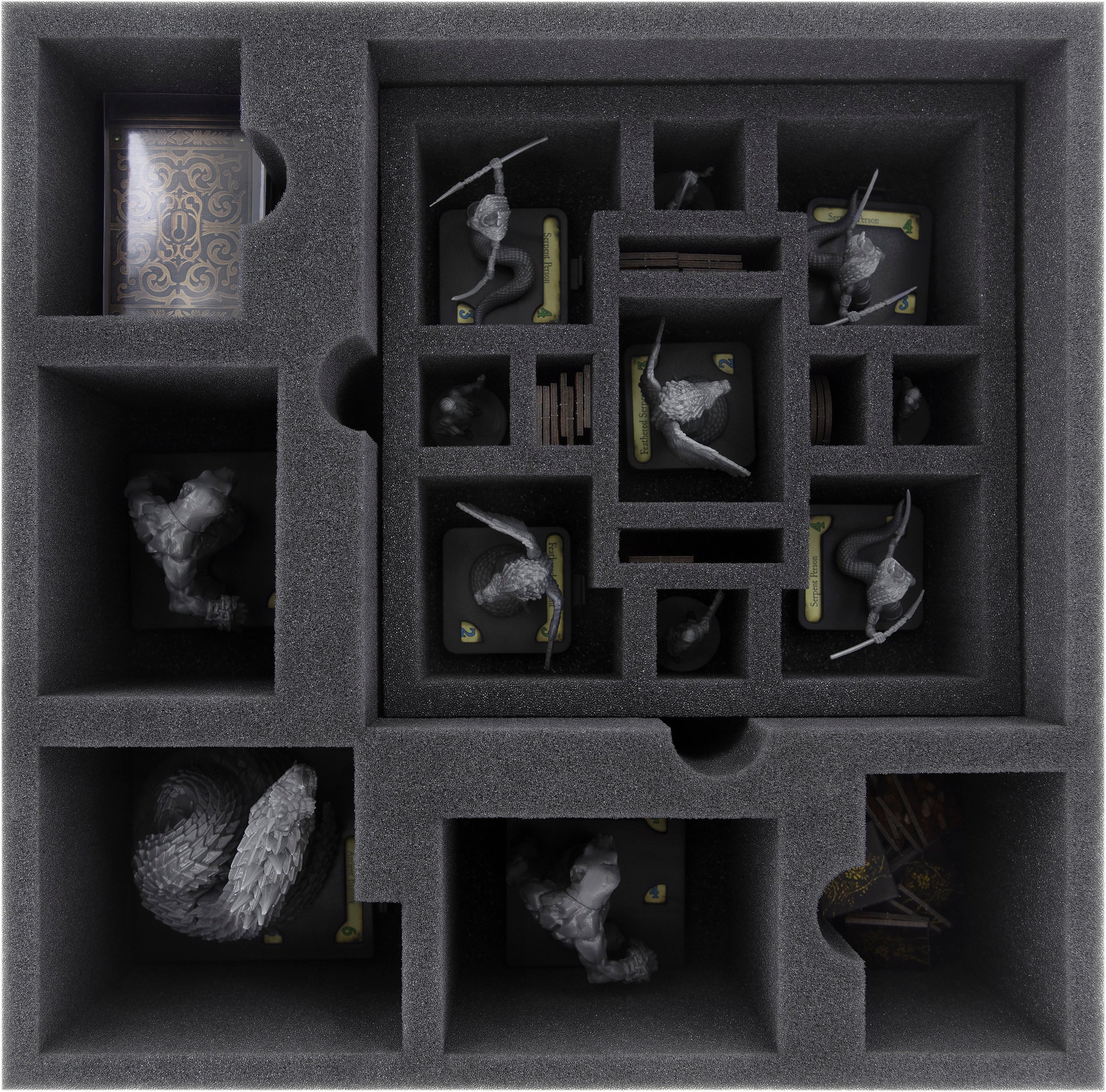 A large foam tray fits exactly into the original game box. It is divided into five compartments for miniatures and accessories, and a large compartment for the foam inlay.