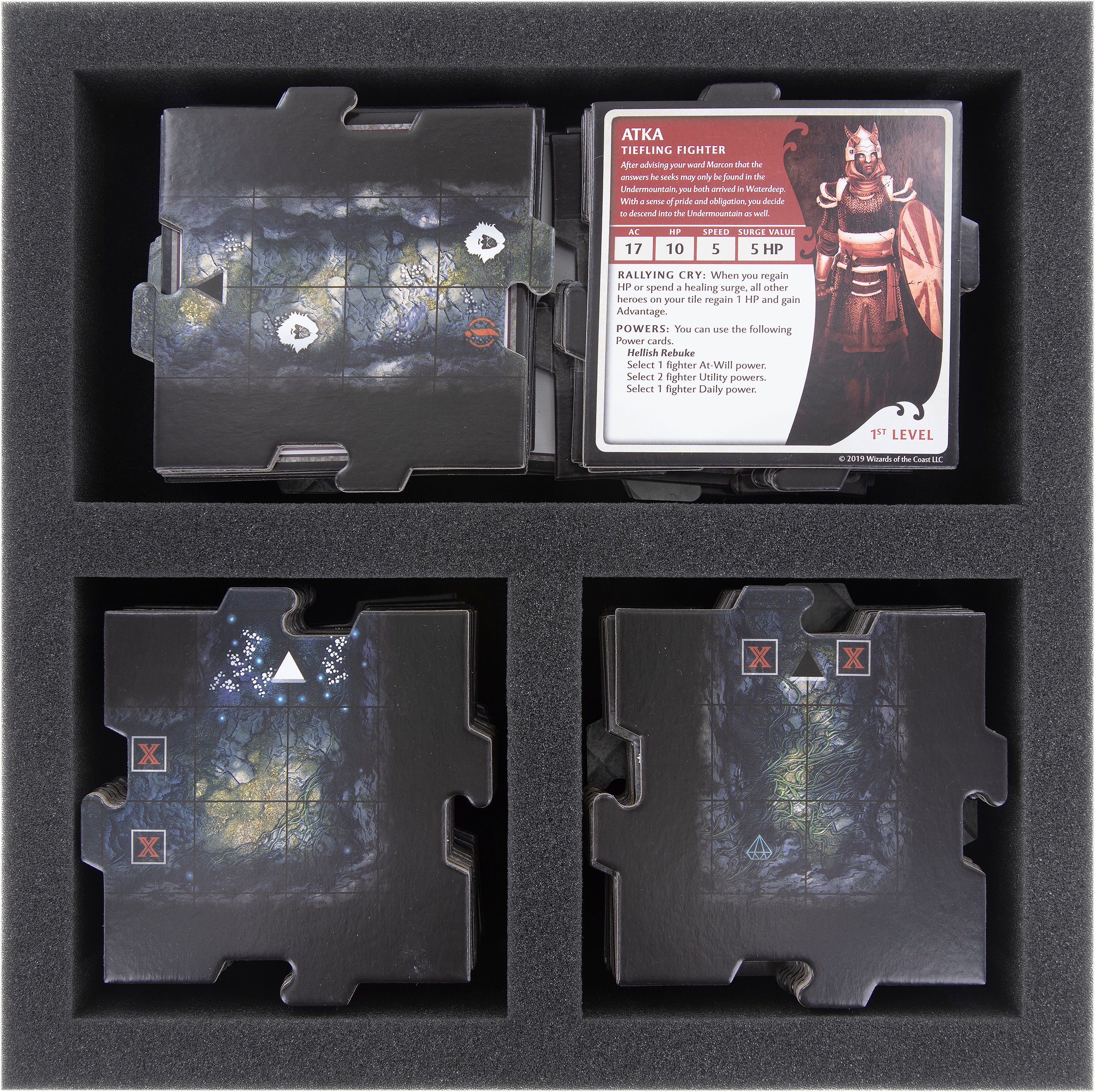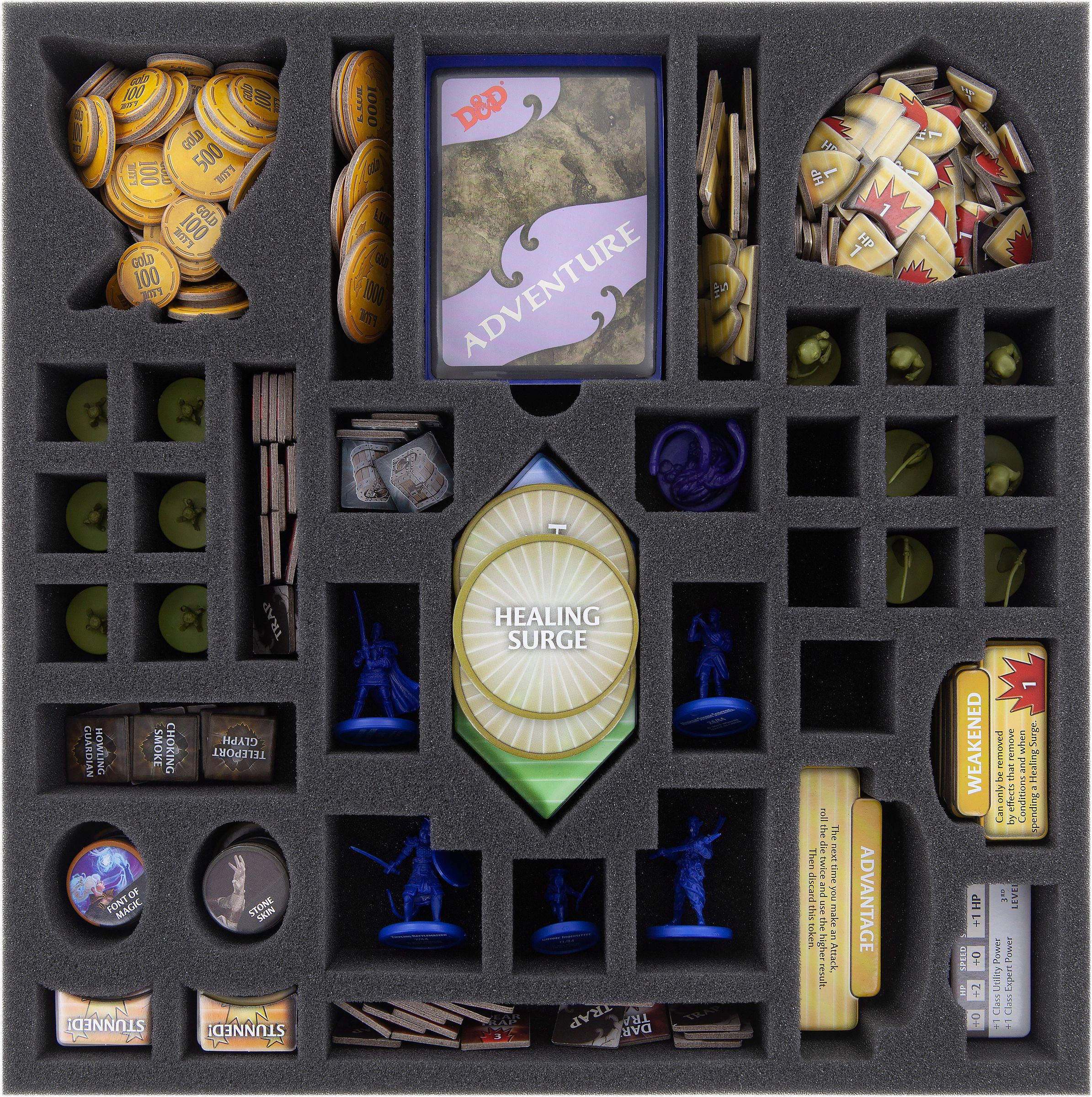 The third foam insert in the set is for storing the Hero, Villain and Dungeon tiles. The cardboard parts can be stowed clearly, don't slide around, and the foam protects the tiles from kinks and chipped edges.