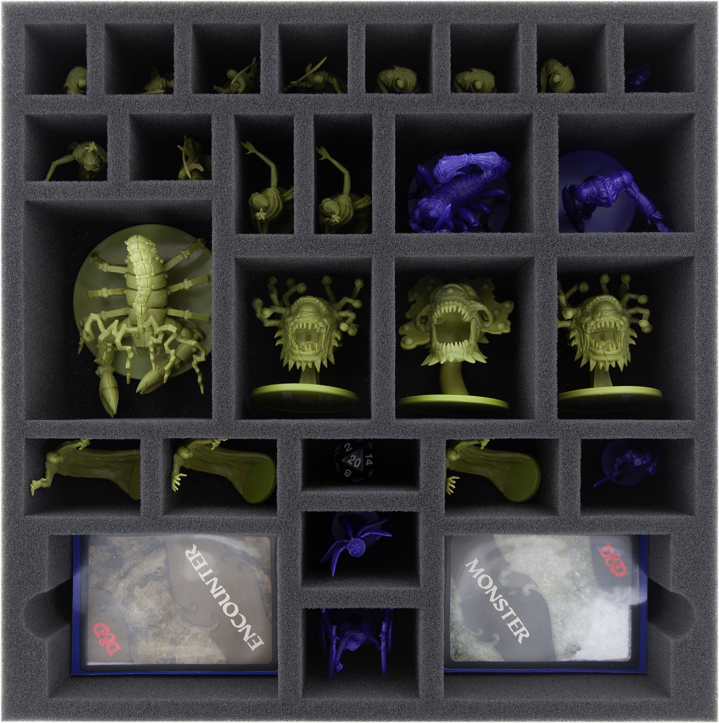 On the second mat the remaining miniatures, especially the heroes, are accomodated. Your five heroes gather in the middle. Small square compartments house the little monsters, like the Grungs and the Intellect Devourers. Also, there is a third compartment for cards.