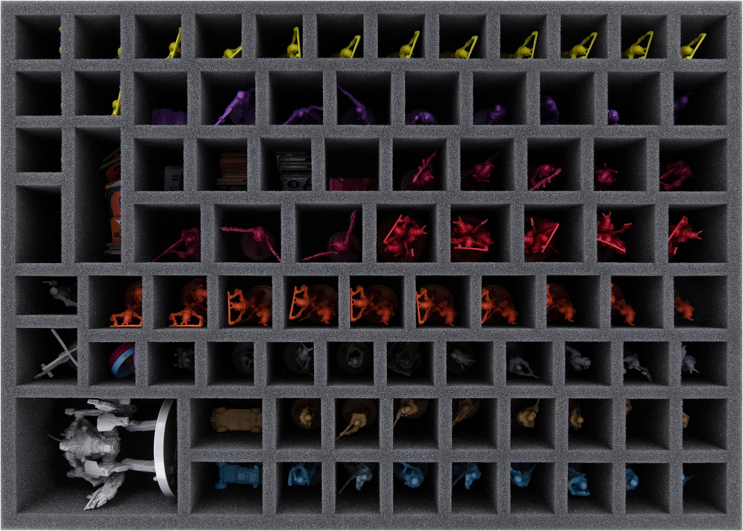 - 1 foam tray with 85 compartments for miniatures and small-sized game material like Mech Tiles, Faction Base Tiles, Outpost Tiles, Stat trackers and Faction Rings