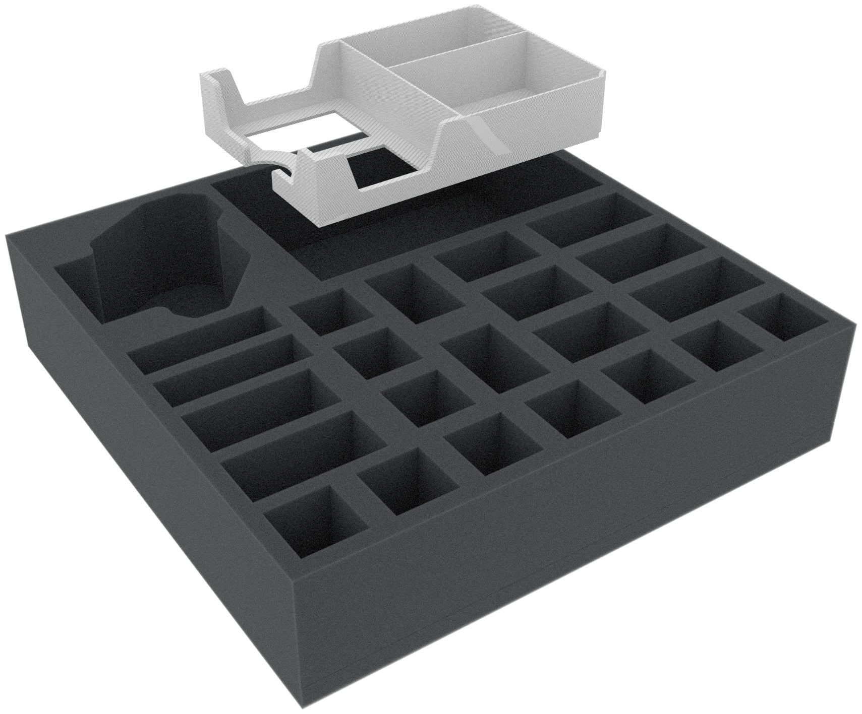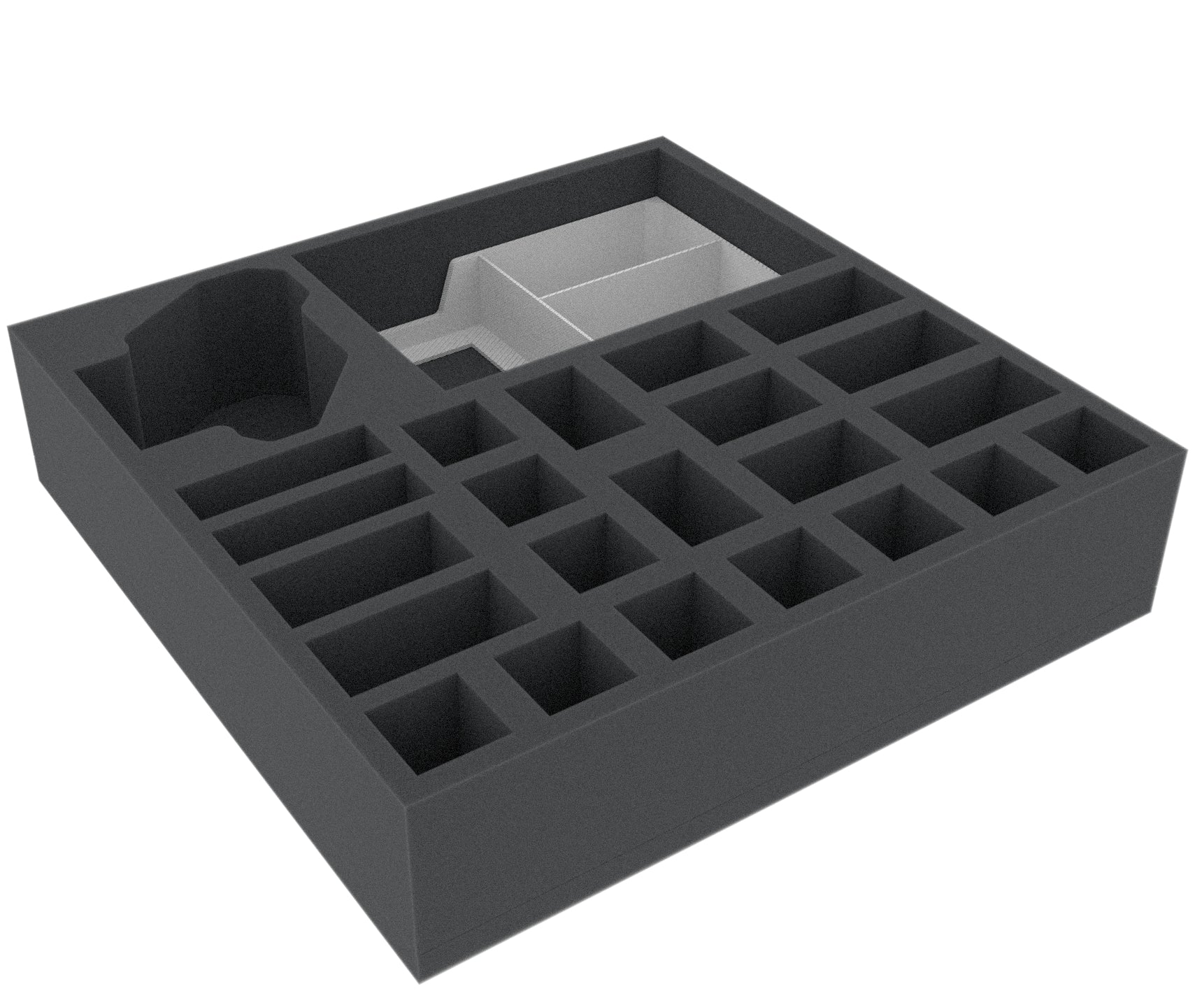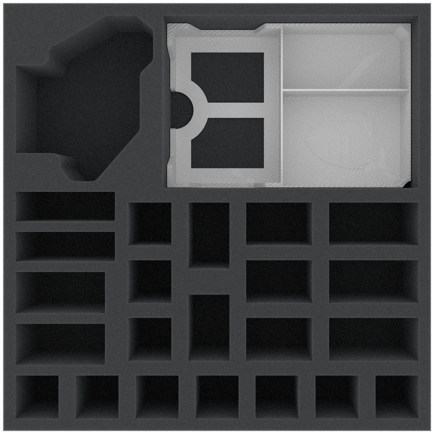 The 60 mm high foam tray offers you a total of 24 compartments in which your miniatures can find refuge from the bitter cold. It doesn't matter if it's mercenaries, yetis, or the two doors. Each miniature gets a matching foam cave. The "Frozen Horror" is even sent into a safe cold sleep in a miniature-precisely cut compartment.