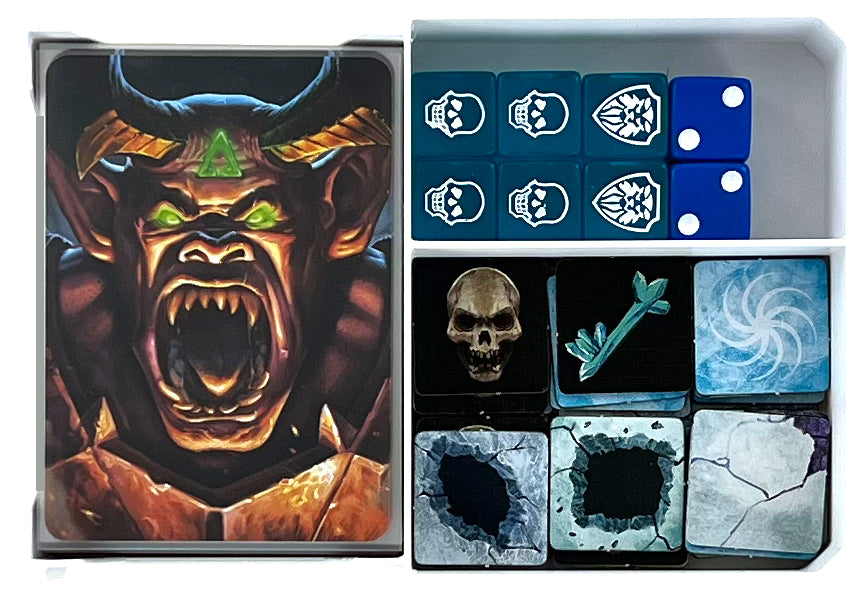 - 1 plastic card holder with three compartments for game cards like a hero card, enemy cards, equipment cards, treasure cards, artifact cards, and spell scroll cards, and for small-sized game material like Movement and Combat Dice, as well as tiles like Magic Ice Tiles, Ice Tunnels, Slippery Ice, Ice Vault, Crystal Key Tile, Blocked Square Tiles, and Skull Tiles