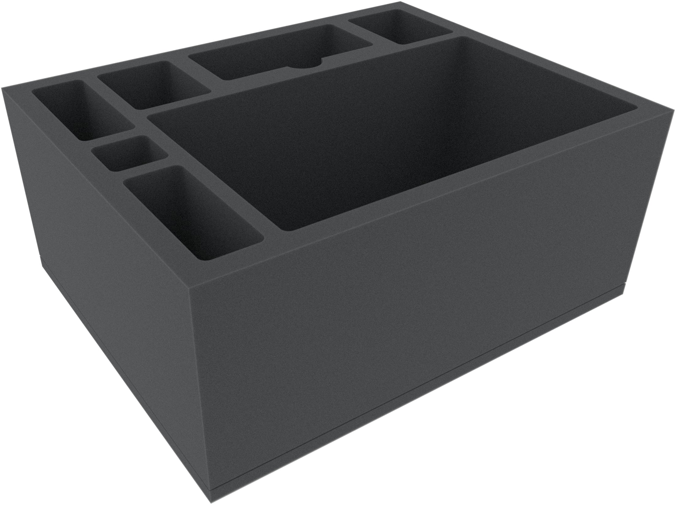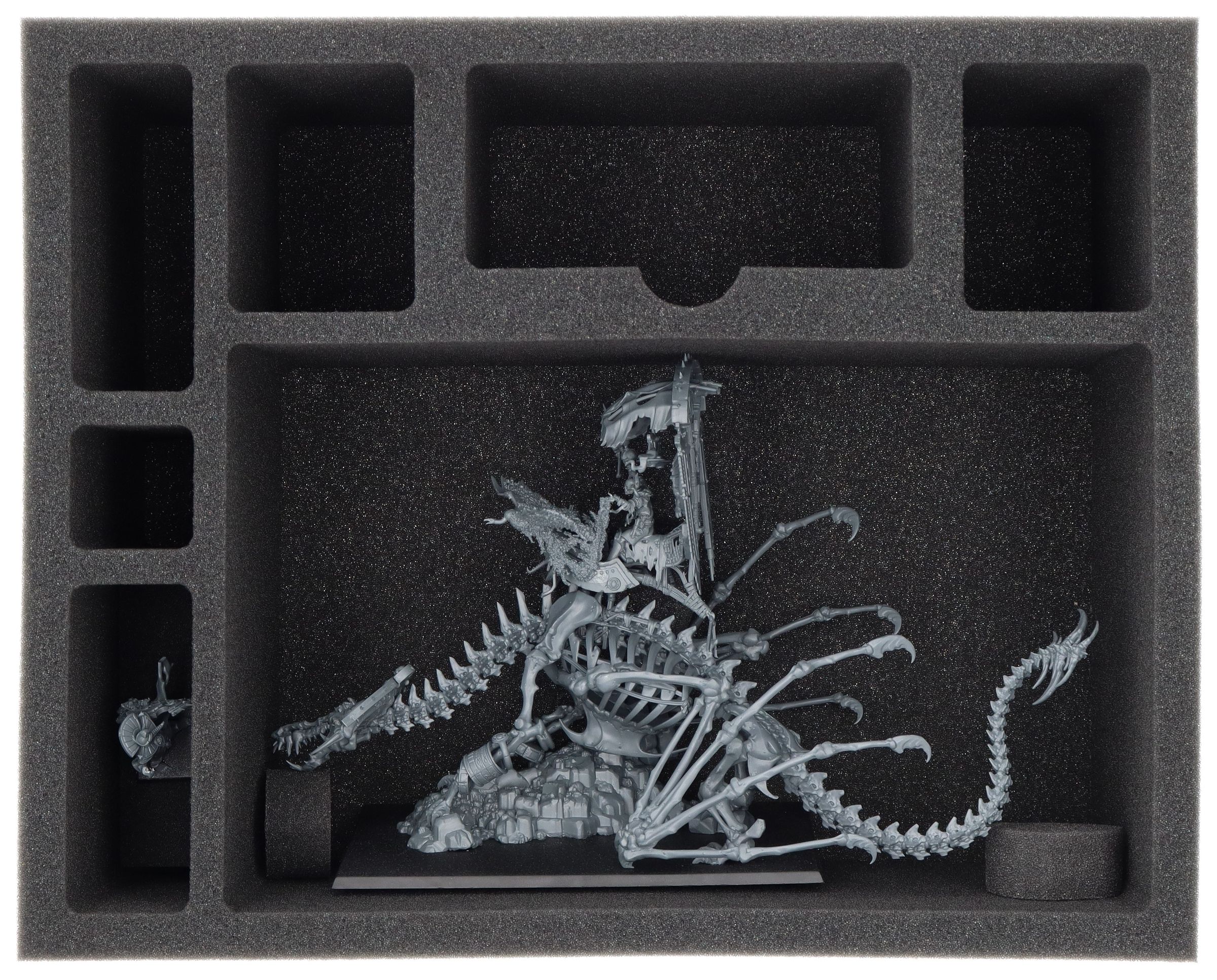 The 145 mm high foam tray is divided into 7 compartments. The large compartment is ideal for securely storing a miniature of a Tomb King/Liche Priest on Necrolith Bone Dragon.