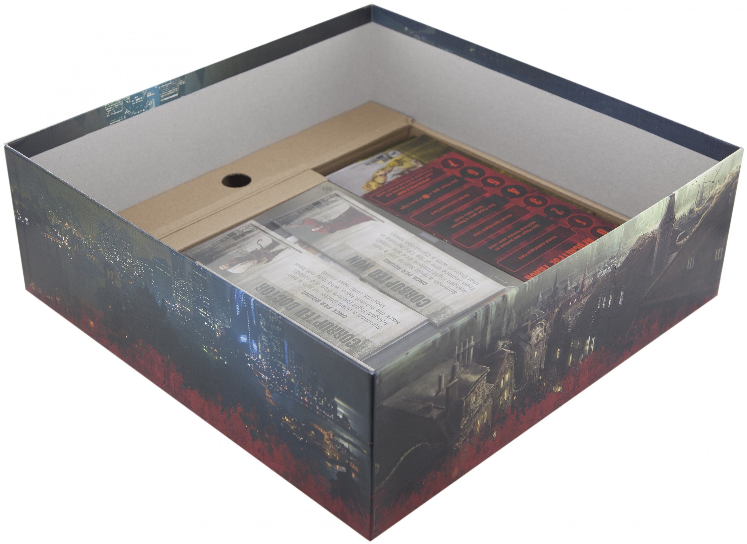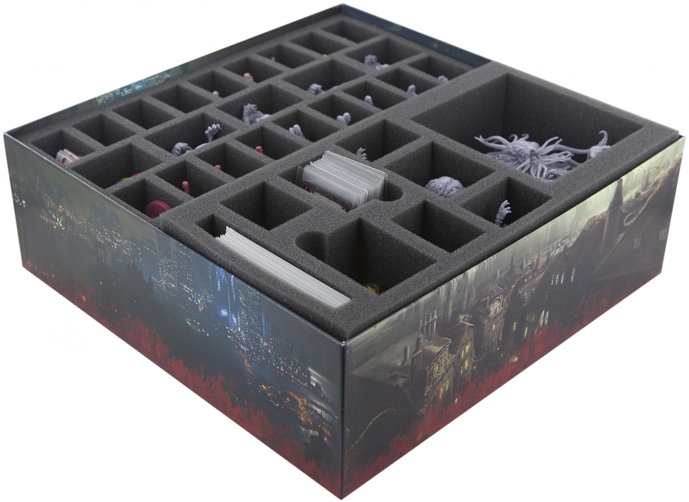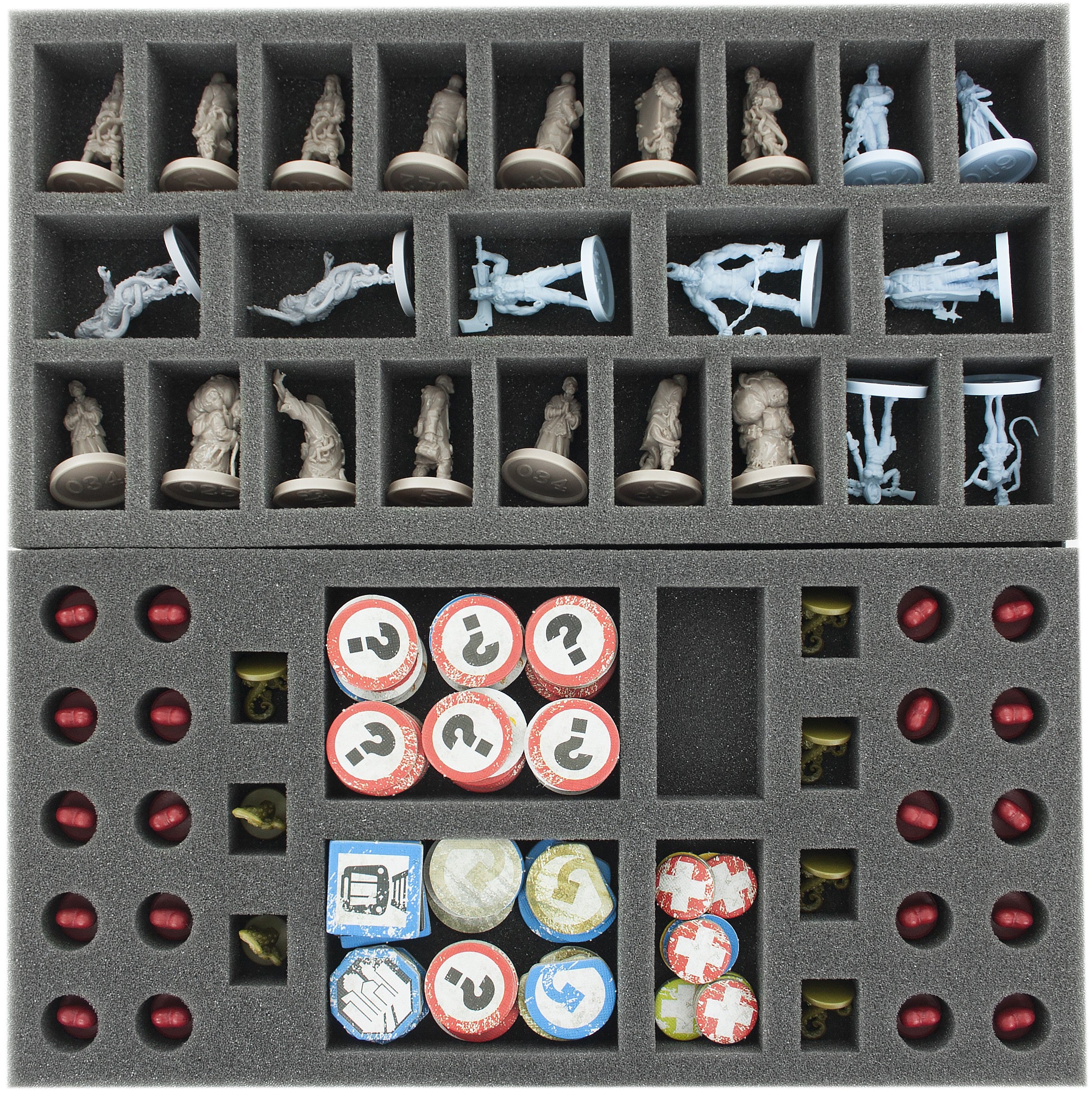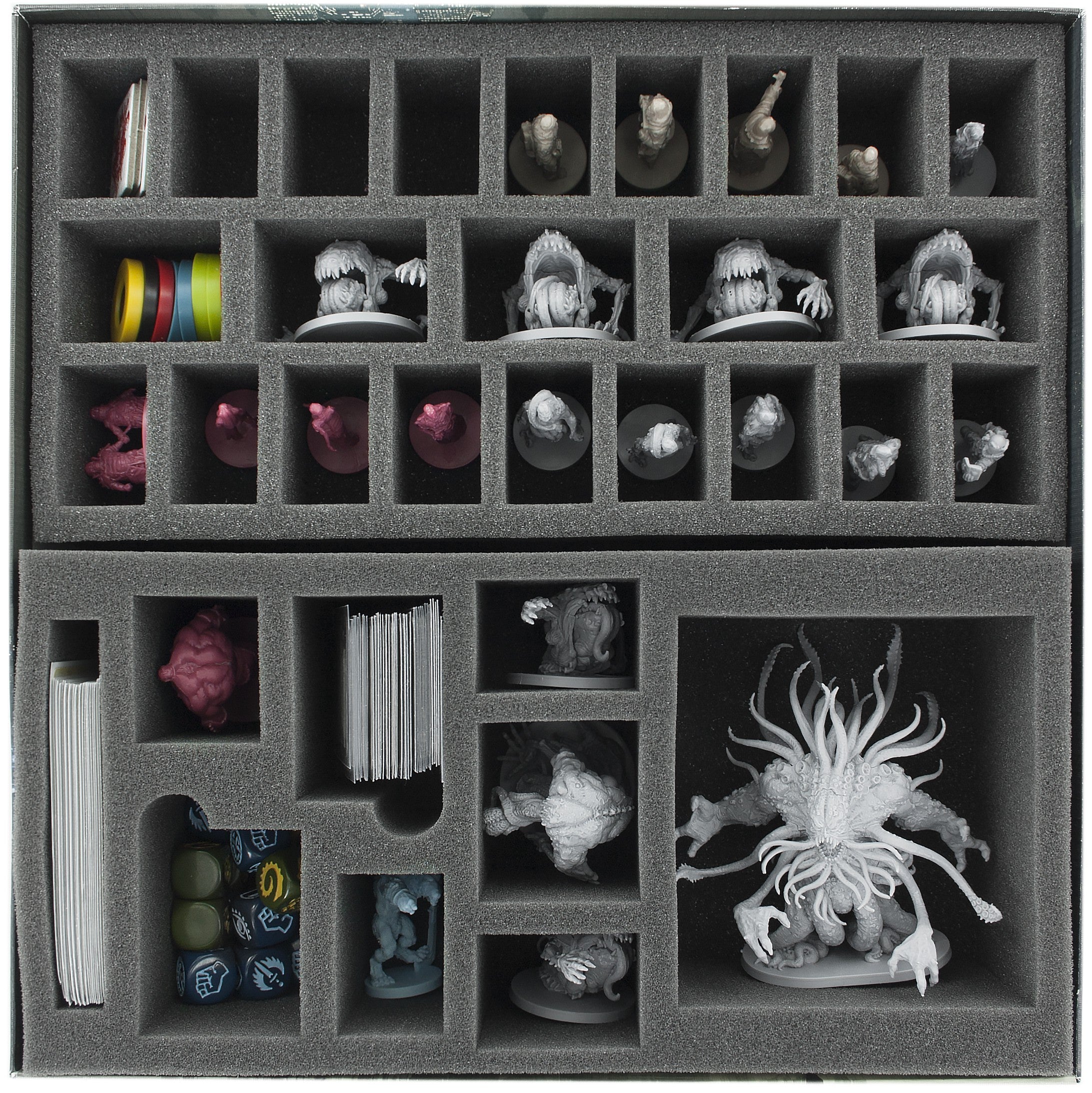 Complete set of foam trays for The Others - 7 Sins. The miniatures from the basic game The Others - 7 Sins, cards in sleeves, dice, tokens and the accessories fit into the trays. The picture in the box shows the state when the whole game is in the board game box!
