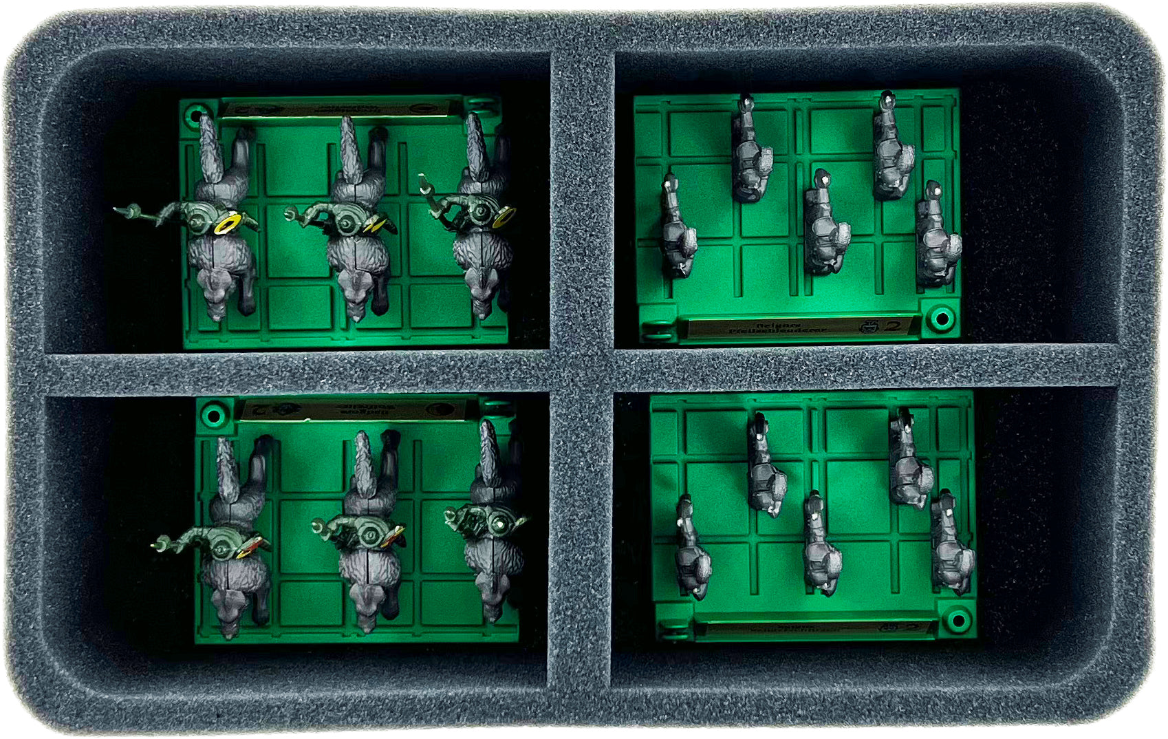 • 2 Full-Size foam trays, each with 6 compartments for ogres and regiments with riders (FSMEKU100BO)
