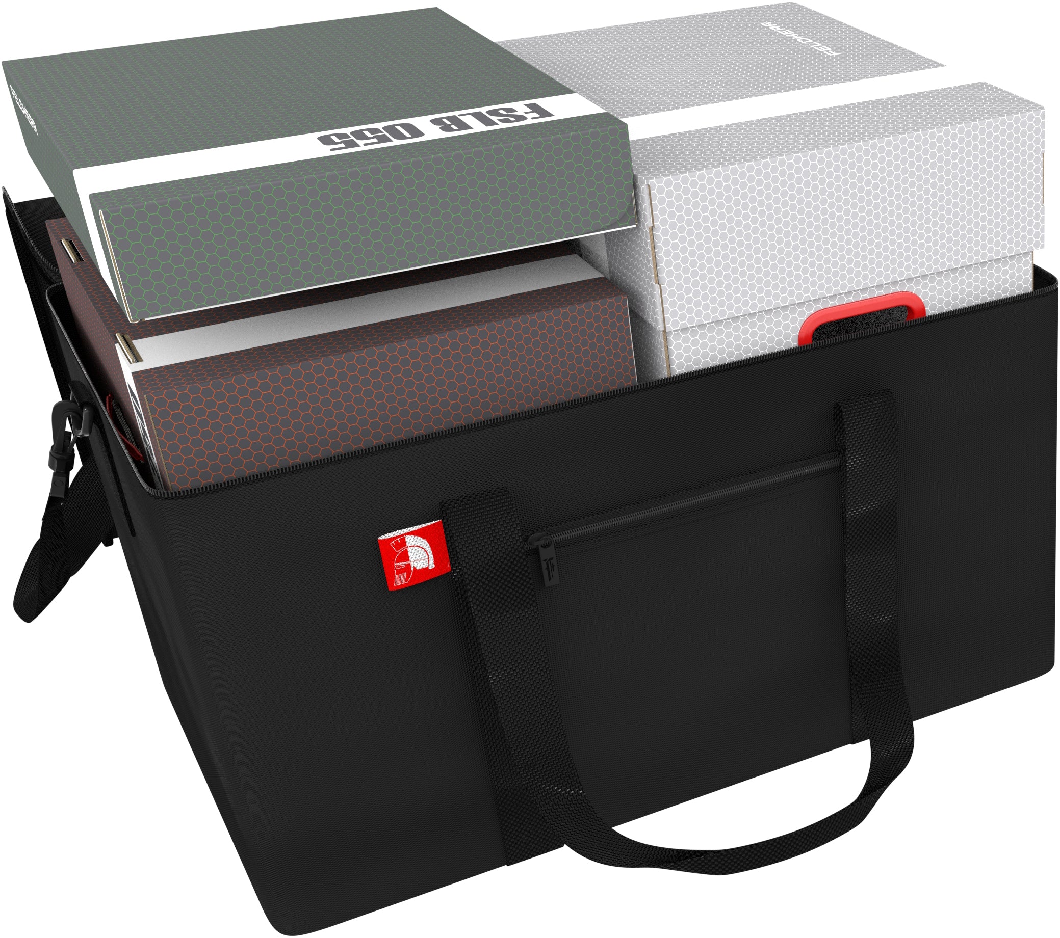 You can transport these three boxes with the Transporter bag made of light but resistant fabric. In addition to the large main compartment, the bag has a small side compartment. It can be lifted with two carrying handles or comfortably shouldered with the sturdy carrying strap.