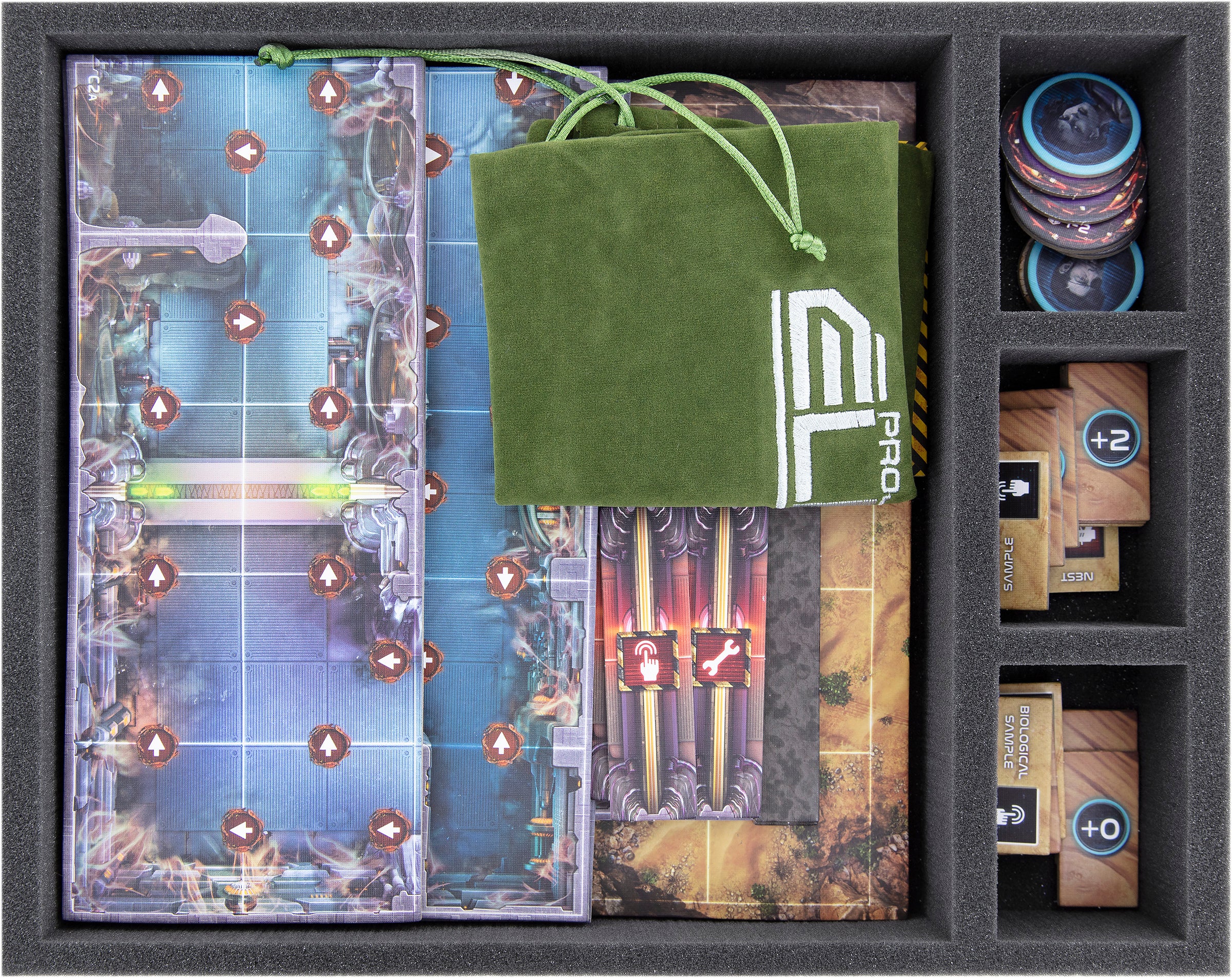 We have packed a total of one Transporter bag, three Storage Boxes, 14 foam trays, two 3D plastic token holders, one foam mat, and three foam toppers so that you can store all 144 miniatures and tokens, as well as all the game material, perfectly protected and arranged.
