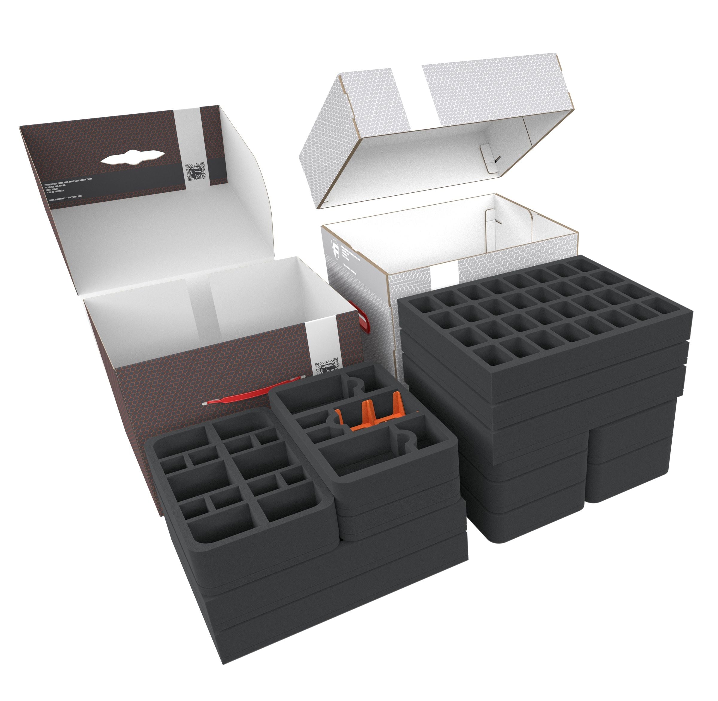 The Storage Boxes FSLB250 and FSLB310 are made of coated, double-walled cardboard. Making them not only pleasantly light but also particularly tear-resistant and stable. With the matching foam trays, miniatures and game material can be stored safely and dust-protected and can also be transported effortlessly with the plastic carrying handle. To make it easier to store and remove the foam mats, one side of the box can be opened completely. The trays are either inserted from above or simply slid into the box from the side.