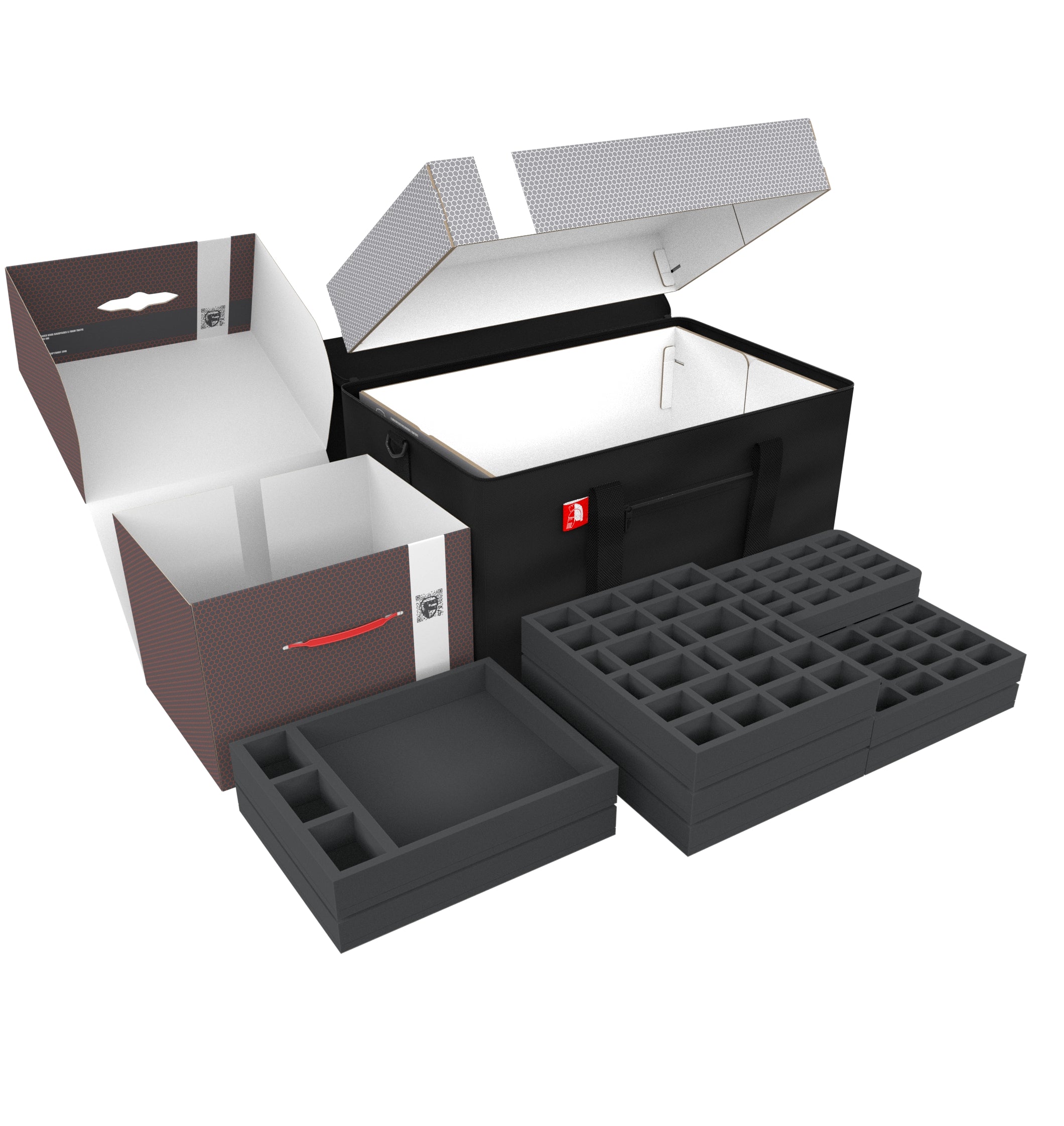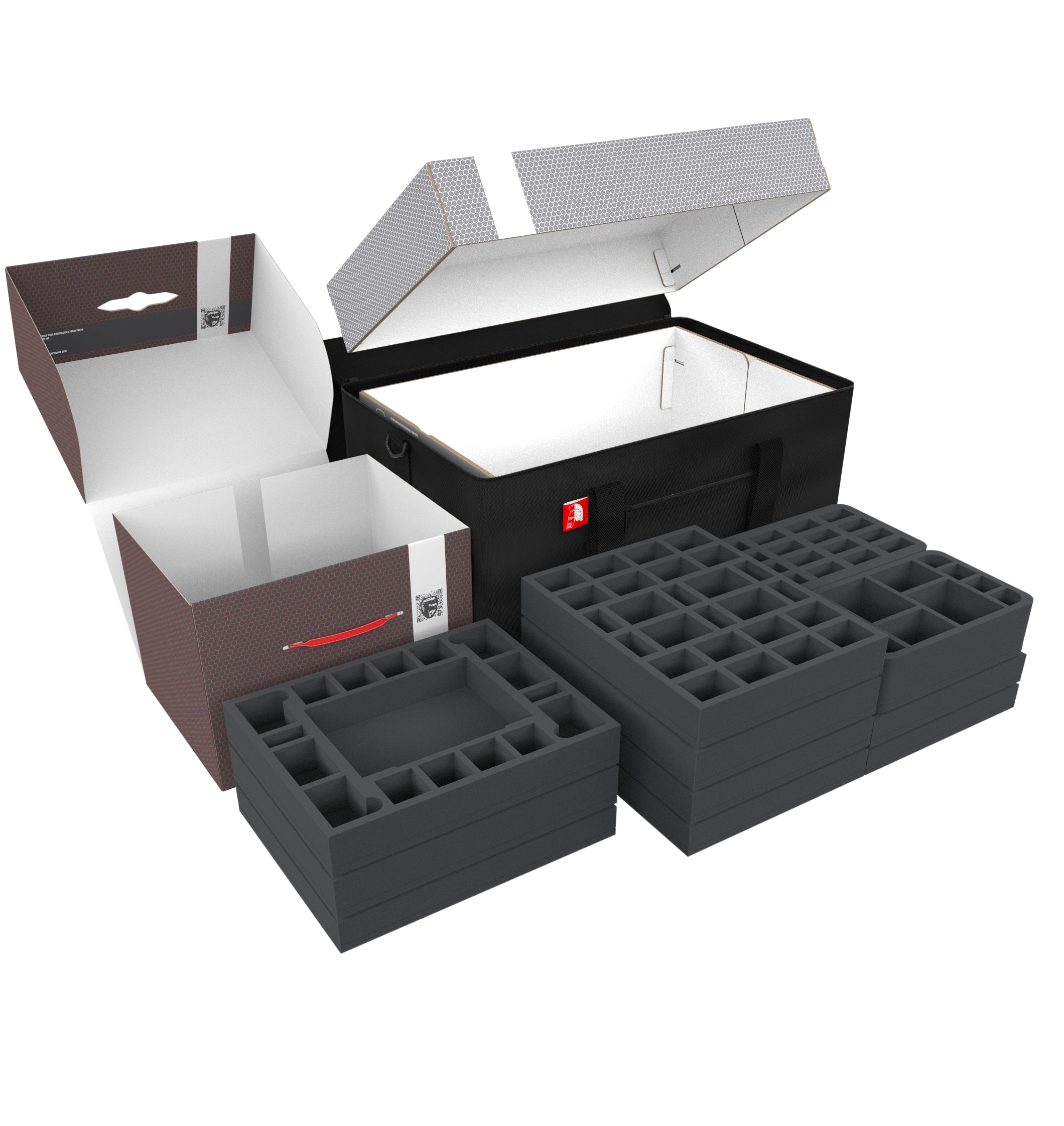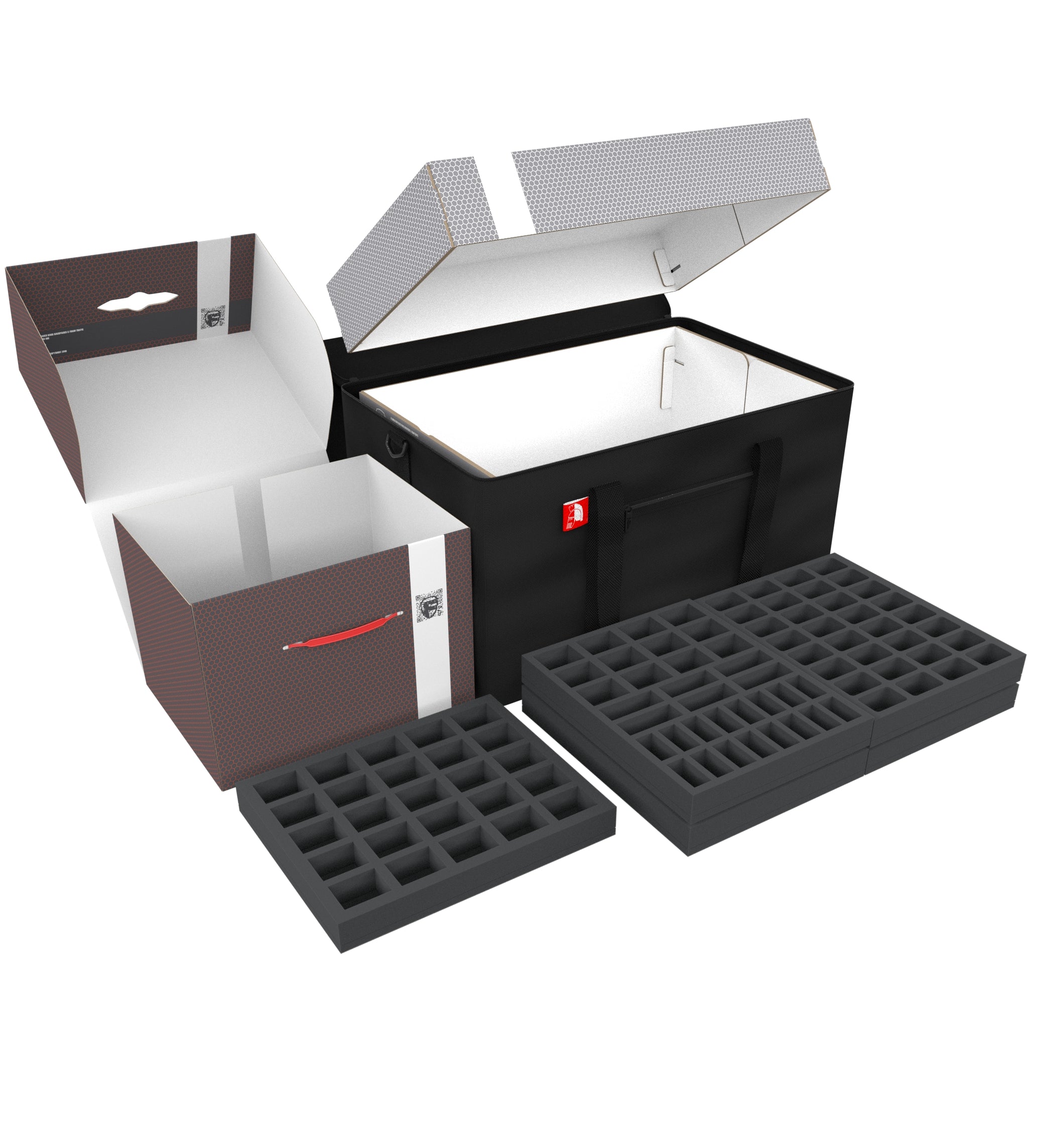 • 5 Half-Size foam trays each with 12 compartments for miniatures and accessories (HSCW075BO)