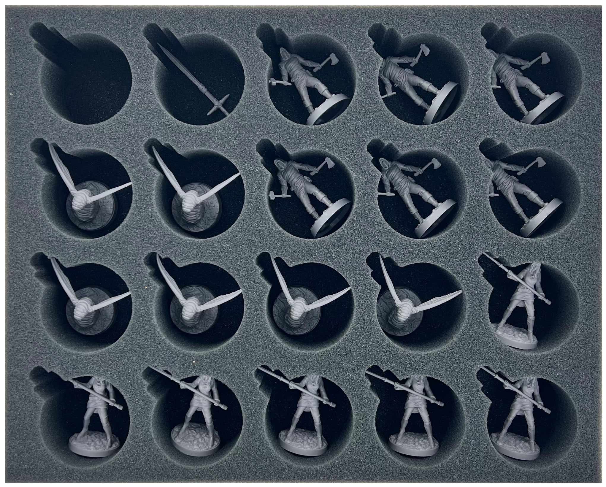 - 1 Full-Size foam tray with 20 circular compartments for standard miniatures and weapons (FSMESZ060BO)