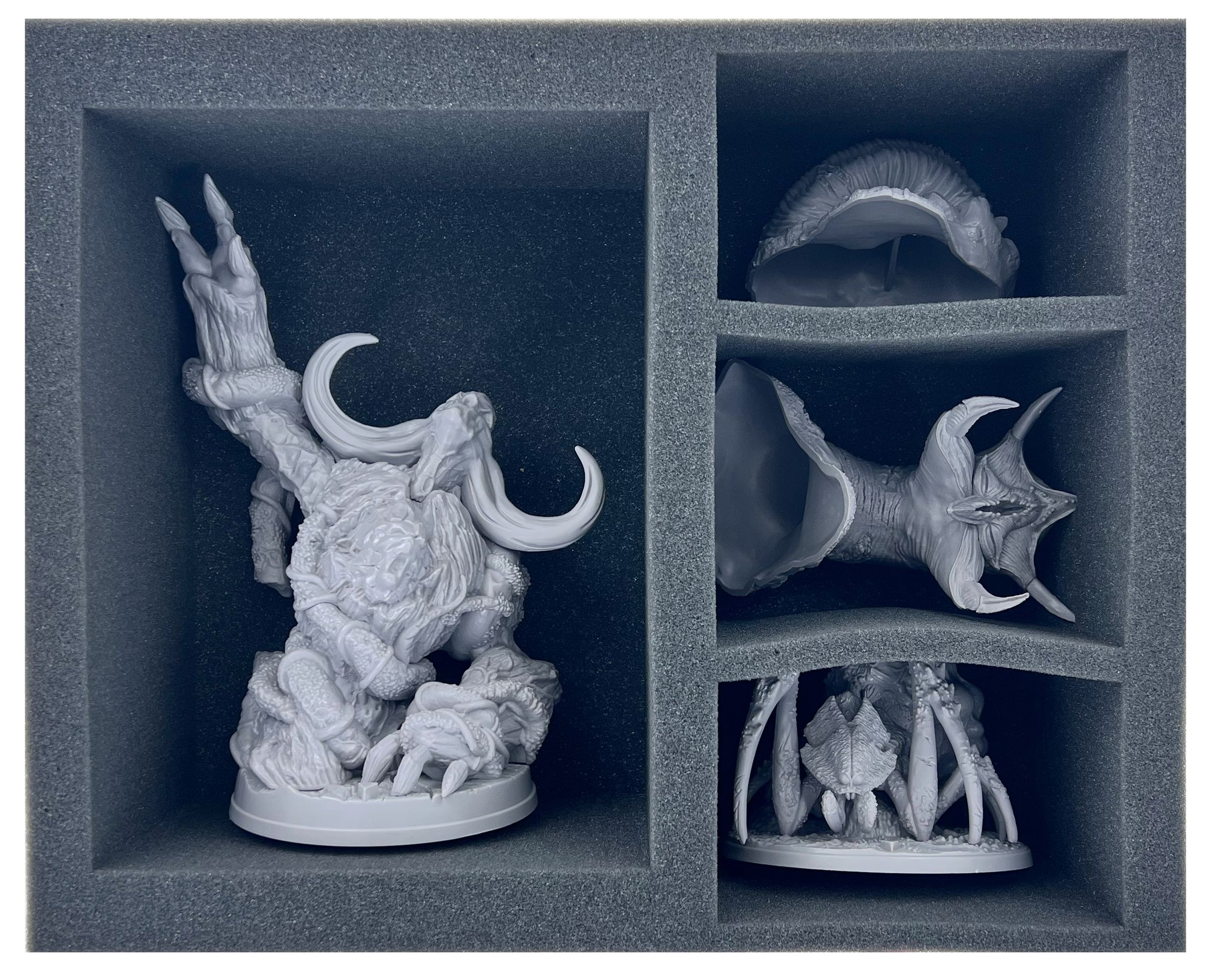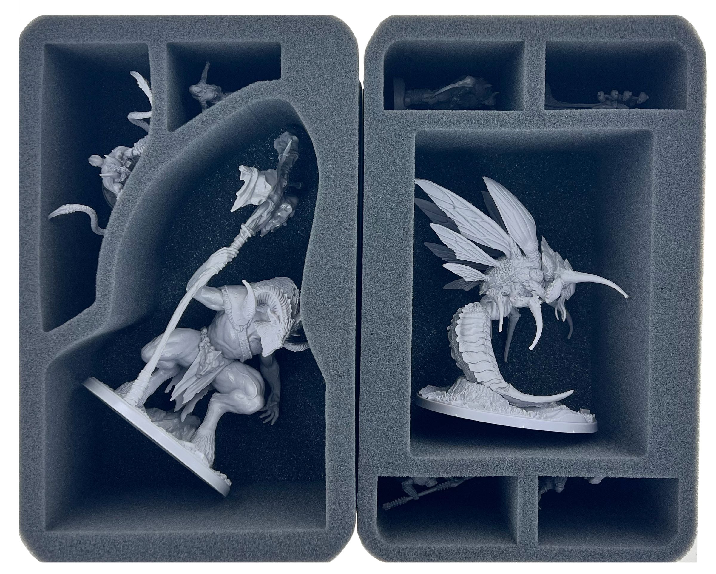 For extra large monsters, we've packed a Pick & Pluck foam tray with a matching base into the set. Fit the figures in place by removing the foam pins to match the outline of the large models. Finally, remove the foil from the bottom of the foam and glue it together with the included foam base.