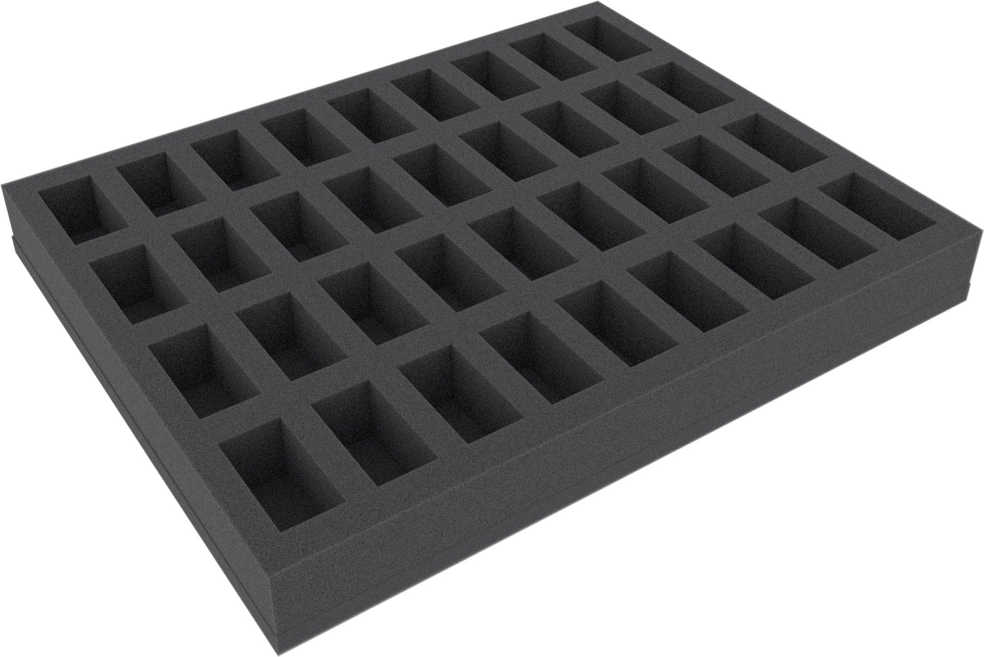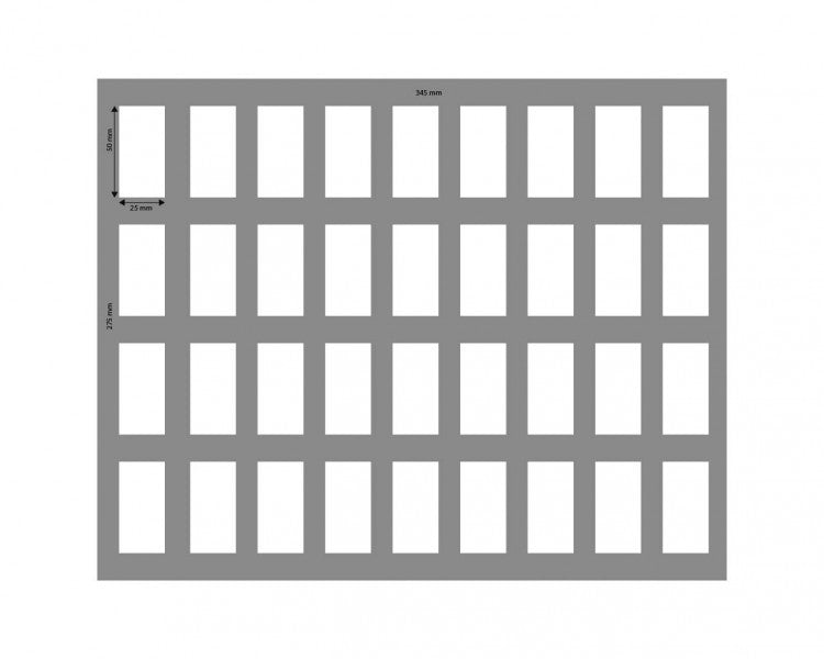 This Full-Size foam tray is divided into 36 compartments. The compartments of equal size are ideal to safely store a variety of standard miniatures in 28 mm scale from various board games and tabletop systems.