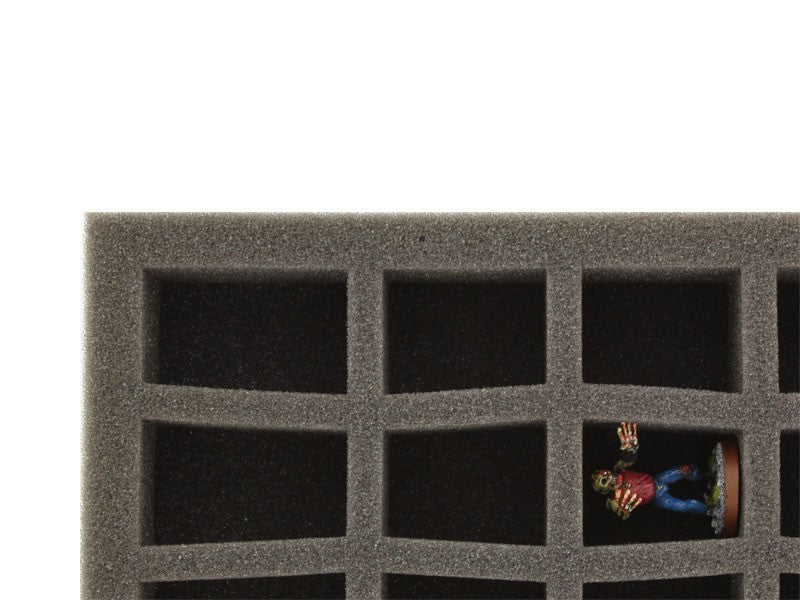 Foam tray with compartments in c-slot design. The compartments have a conical shape. The dimensions of the foam mat with 45 compartments is the same as that of the foam mat with 36 compartments (345 mm x 275 mm). We have them arranged in a space-saving way and optimized the distances between the compartments. On the mat five rows are pre-punched with nine compartments. The conical cut-out shape provides extra space for your miniatures.