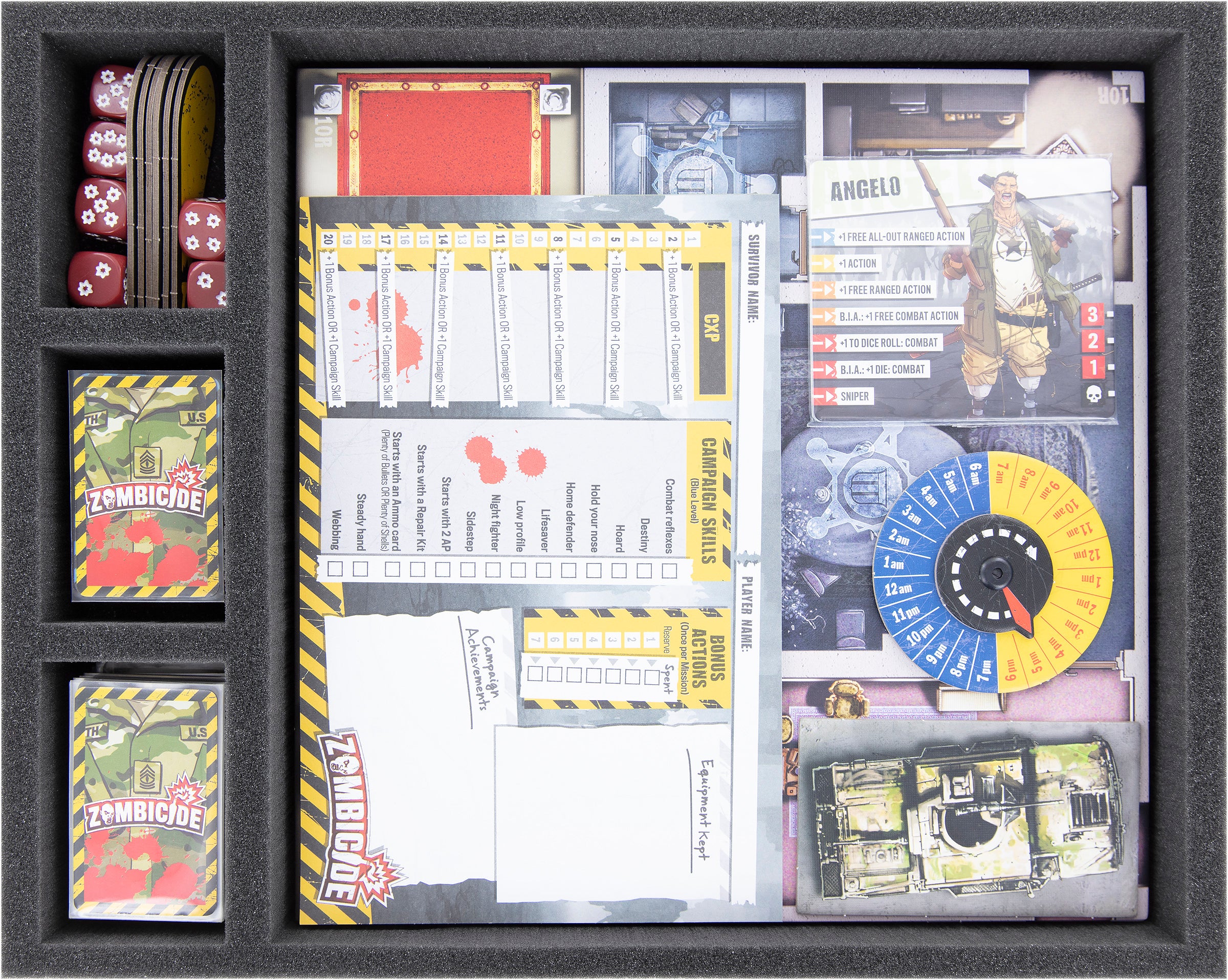 This Full-Size foam tray has a large compartment that holds up to 20 Zombicide tiles. The foam optimally protects the edges from wear and tear during storage and transport.