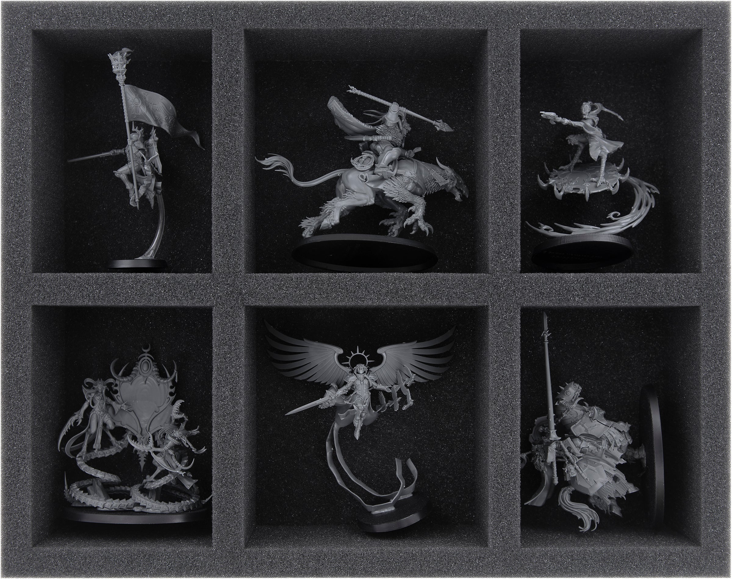 With this foam insert, up to 6 larger miniatures can be optimally protected and return unharmed to the tabletop. The compartments of different sizes are best suited for Celestine, the Living Saint, the Zephyrim Superior and similar sized miniatures.