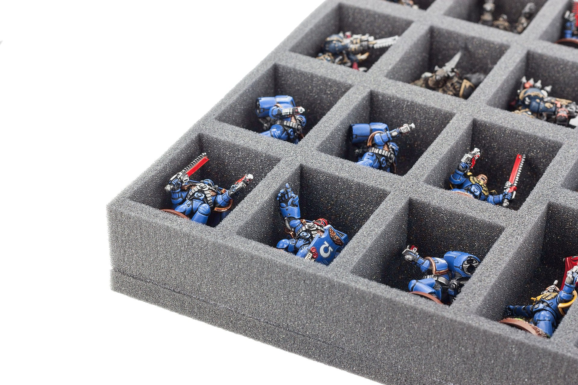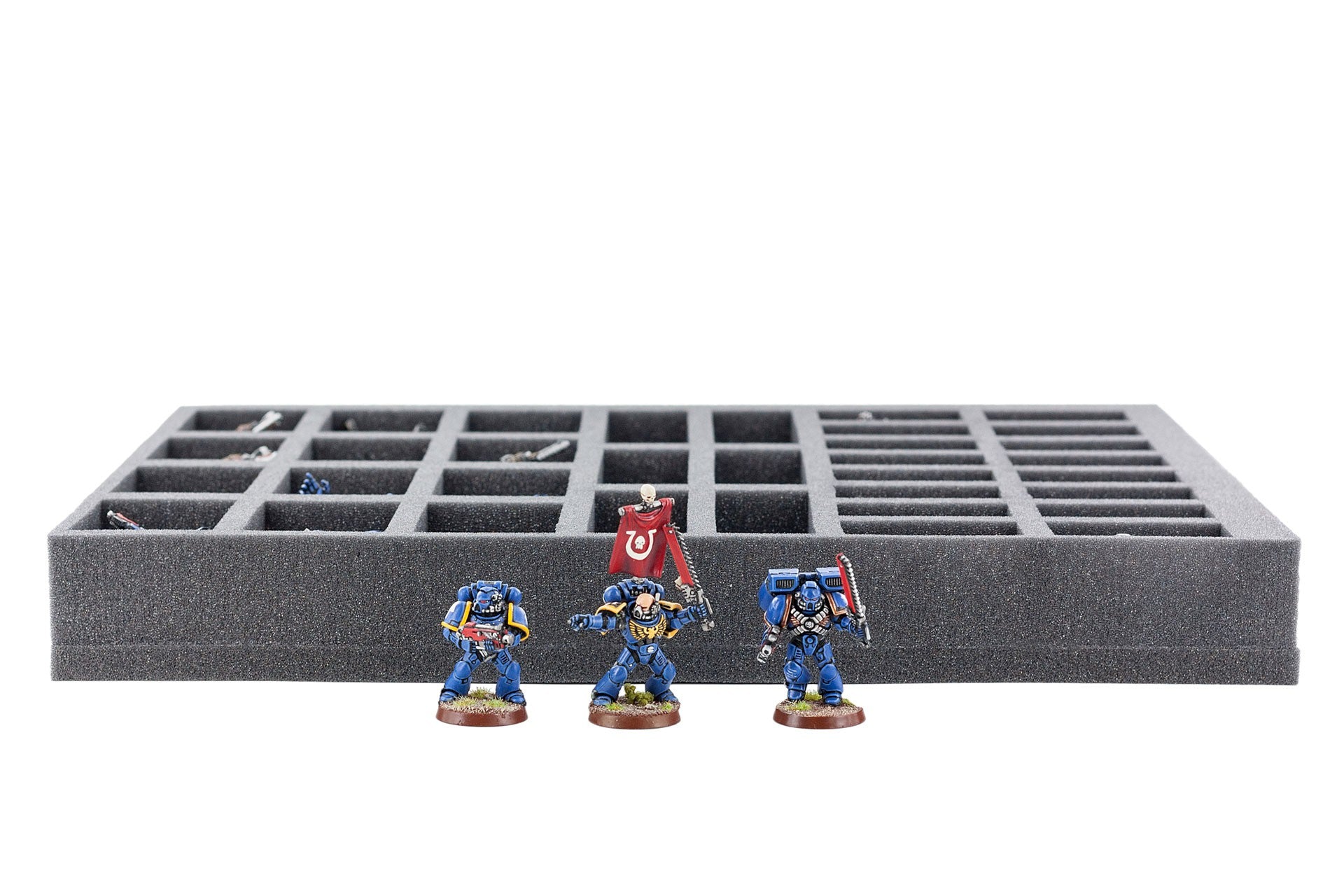 This foam tray has 34 compartments of different sizes. Ideal for bulky miniatures or game material.