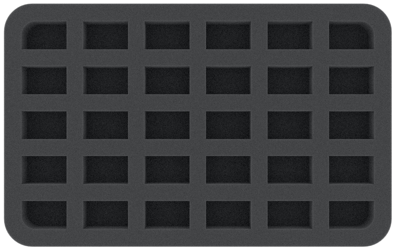 This Feldherr foam tray has 30 same-sized compartments for the clear and safe storage of wargaming miniatures in scale 1:100 (15 mm). The tray is thus ideally suited for miniatures of e. g. the games "Flames of War" or “Dropzone Commander".