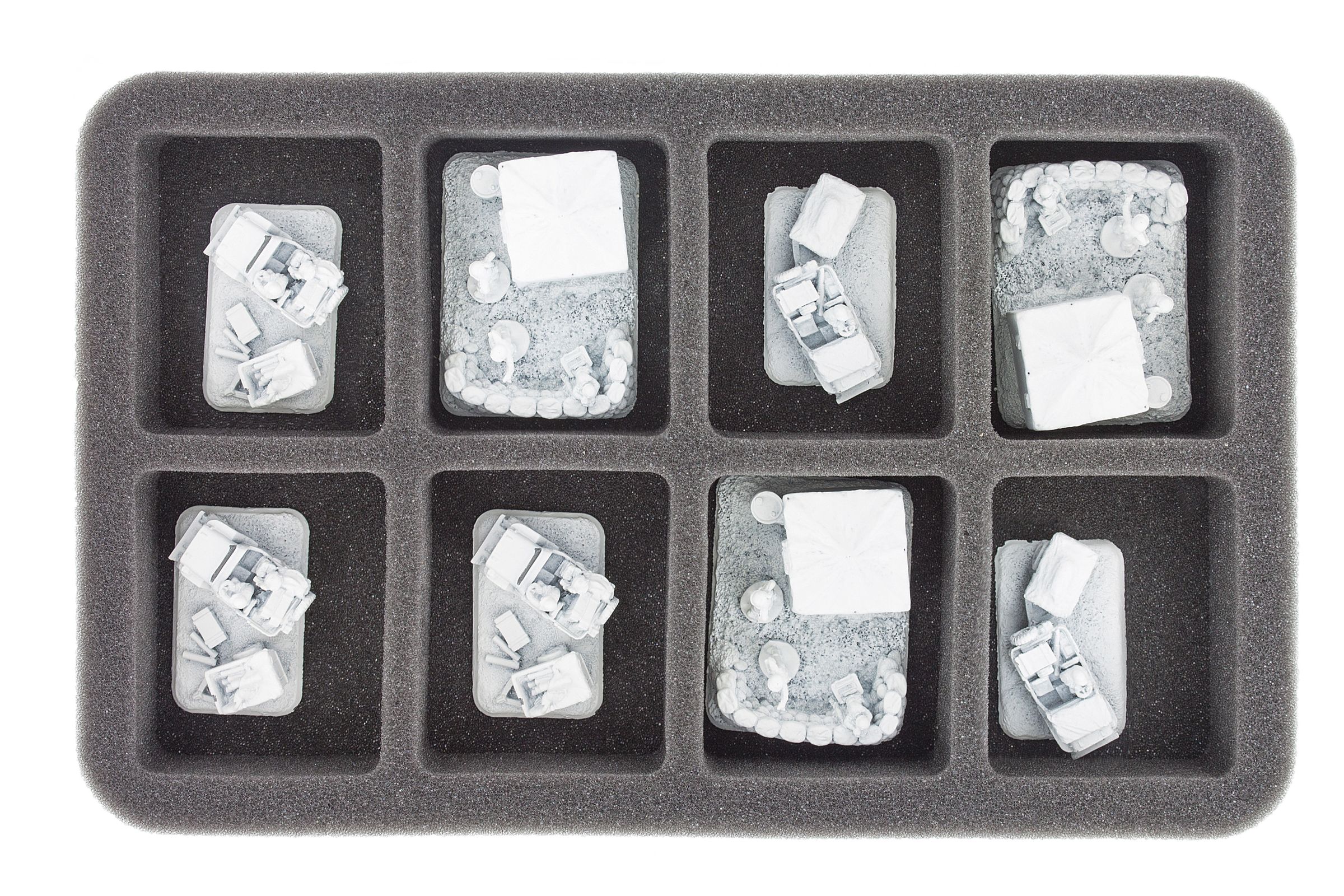 This Feldherr foam tray has 8 same-sized compartments for the clear and safe storage of wargaming miniatures in scale 1:100 (15 mm). The tray is thus ideally suited for miniatures of e. g. the games "Flames of War" or “Dropzone Commander".