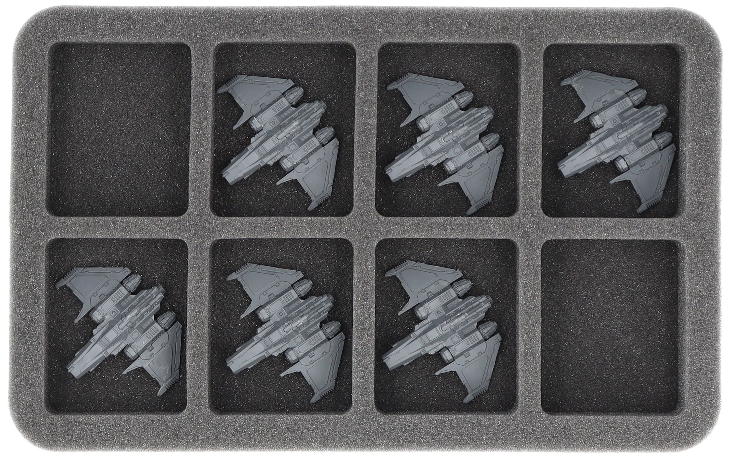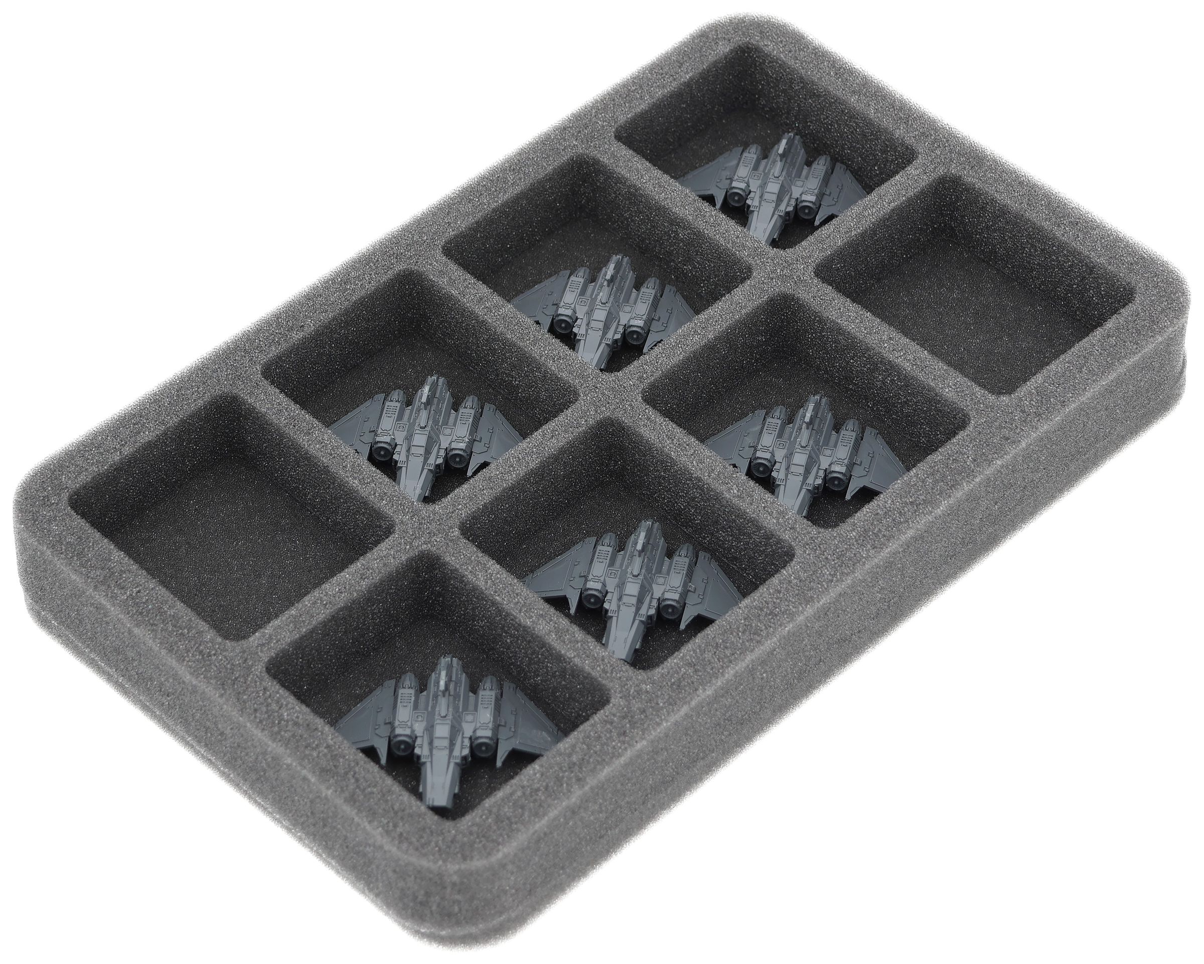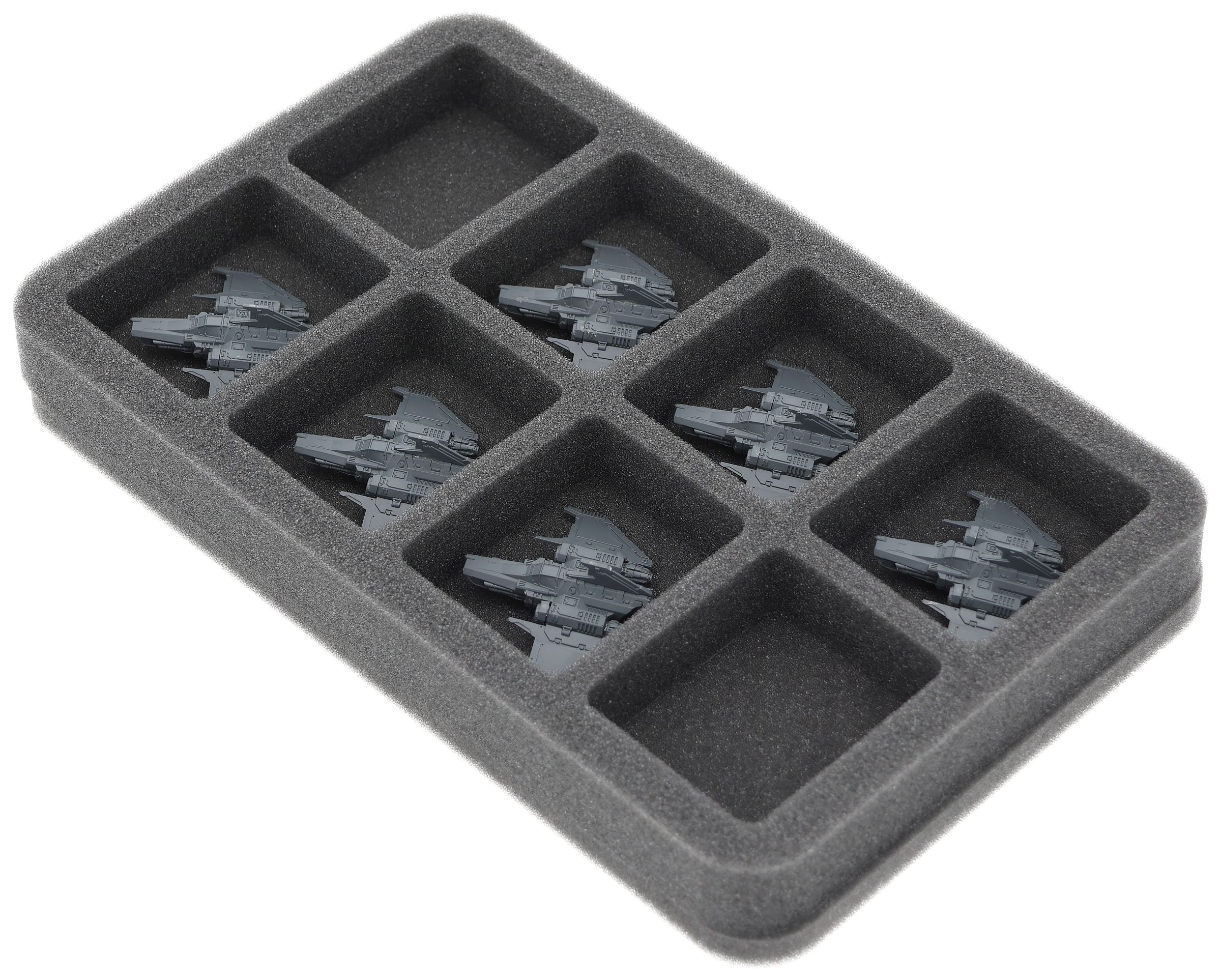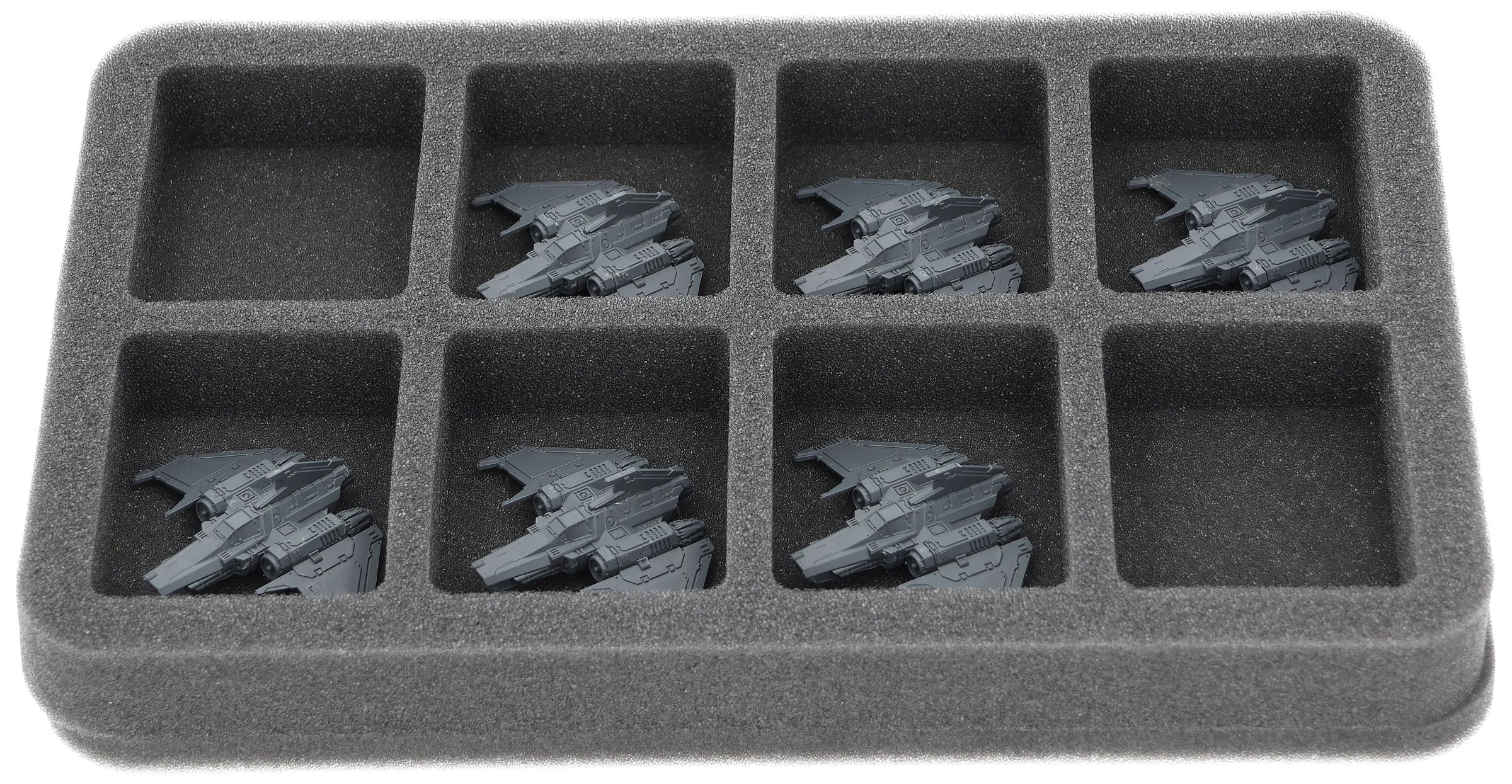 On this Feldherr foam tray you have space for up to 8 miniatures of your army. The insert is especially suitable for storing the Xiphon Interceptor Squadron "without base" and similar sized models.