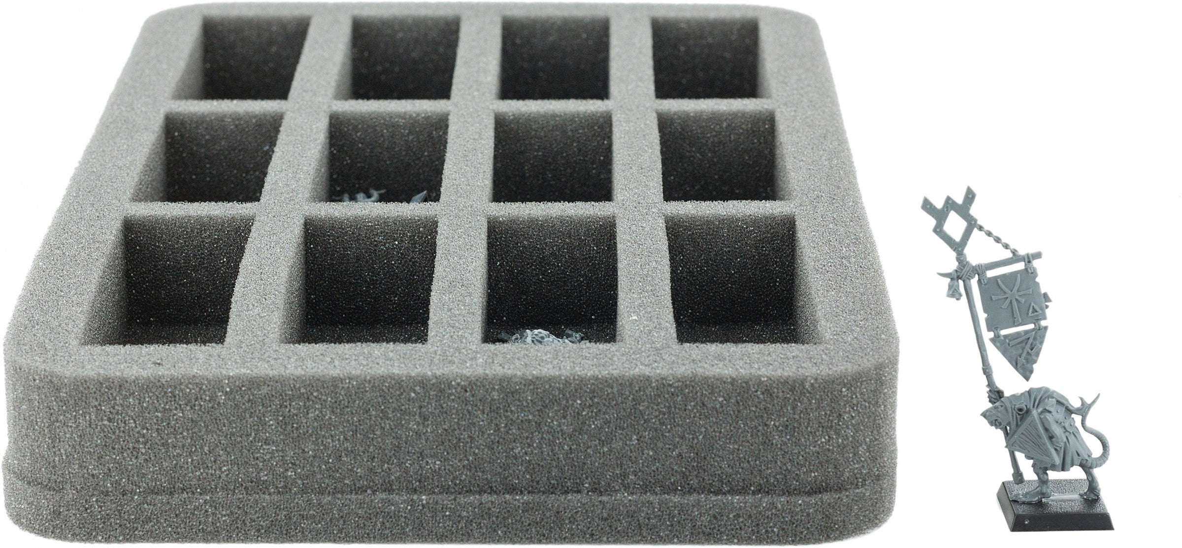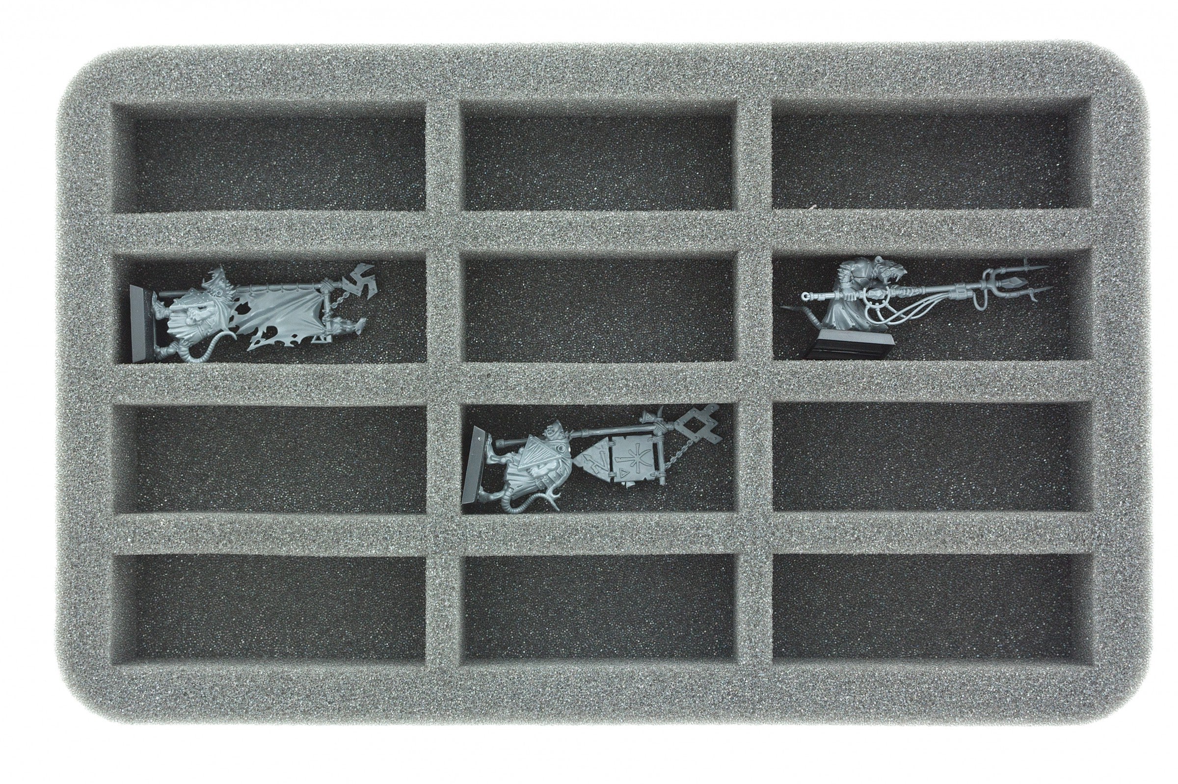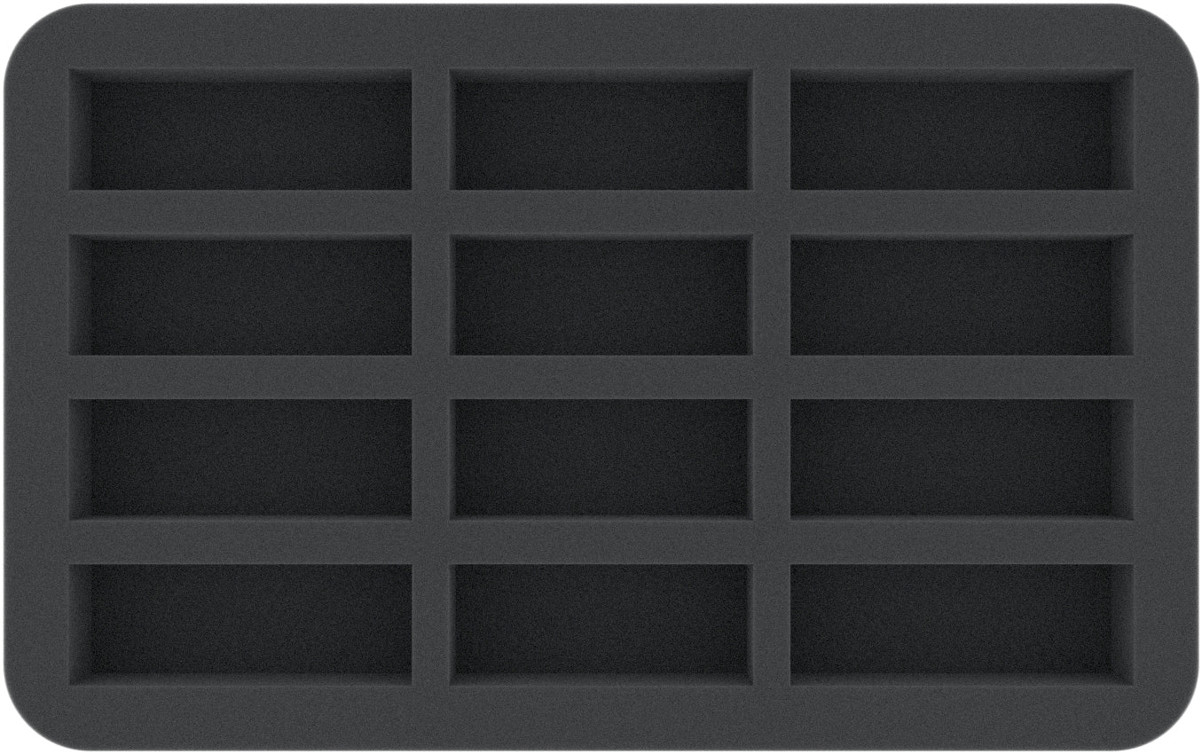 This Half-Size foam tray is divided into 12 longish compartments of different sizes. This makes it ideal for miniatures with swords, muskets, or spears from various board games and tabletop systems. Also game material, such as dice and tokens, can be clearly arranged here.