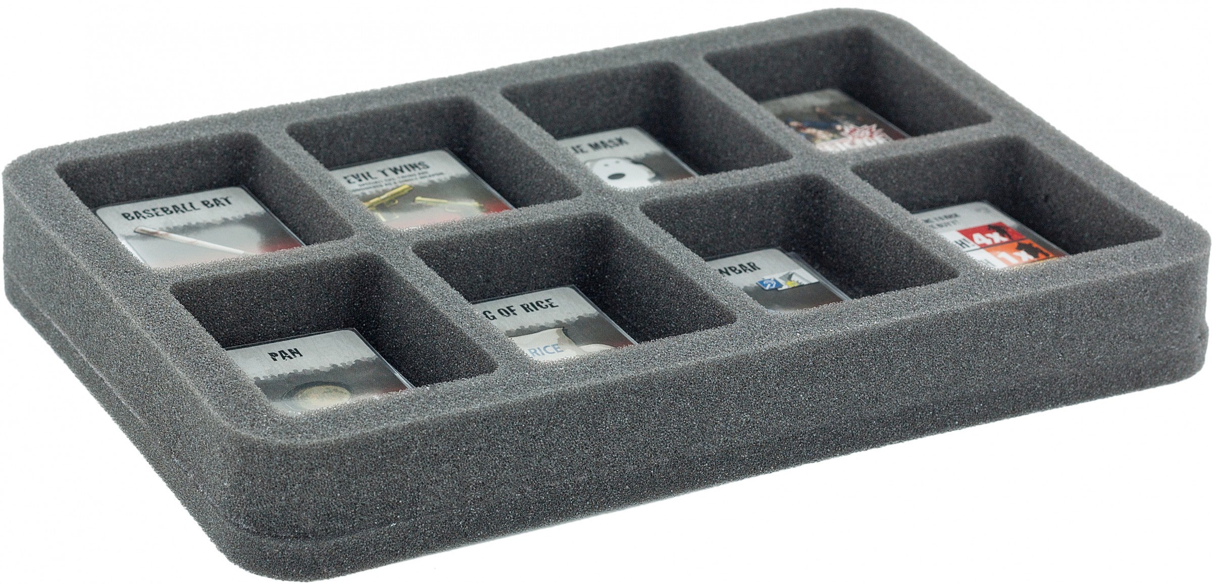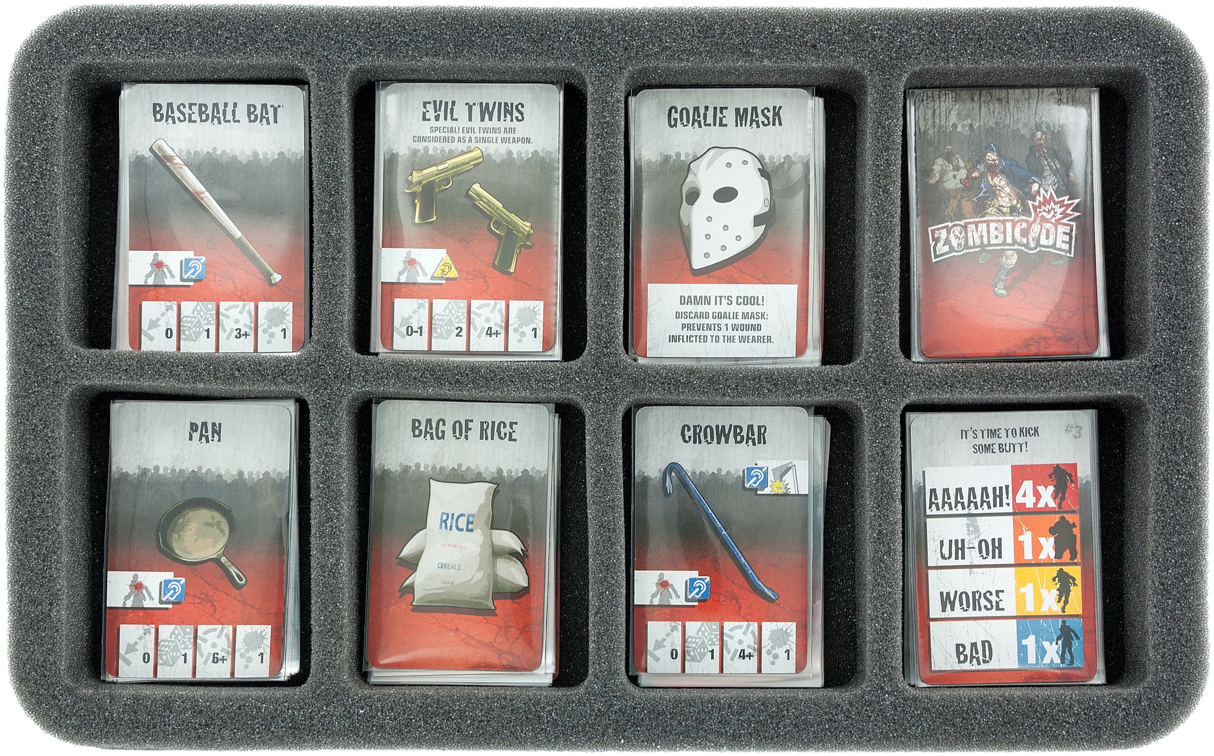 Special tailored foam tray for Zombicide cards and token! Ready to use - glued 10 mm foam base. The 35 mm depth of the foam is result from 10 mm foam base and slot foam tray with 25 mm effective depth.