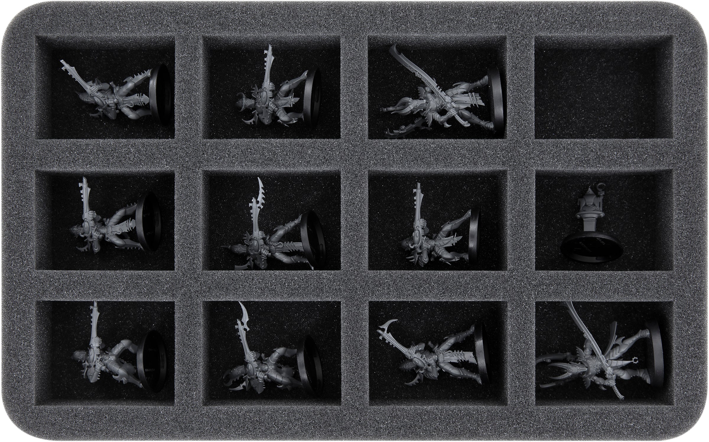 On this Feldherr foam tray you have space for up to 12 miniatures of your army. The insert is especially suitable for storing the Wyches and similar sized models.